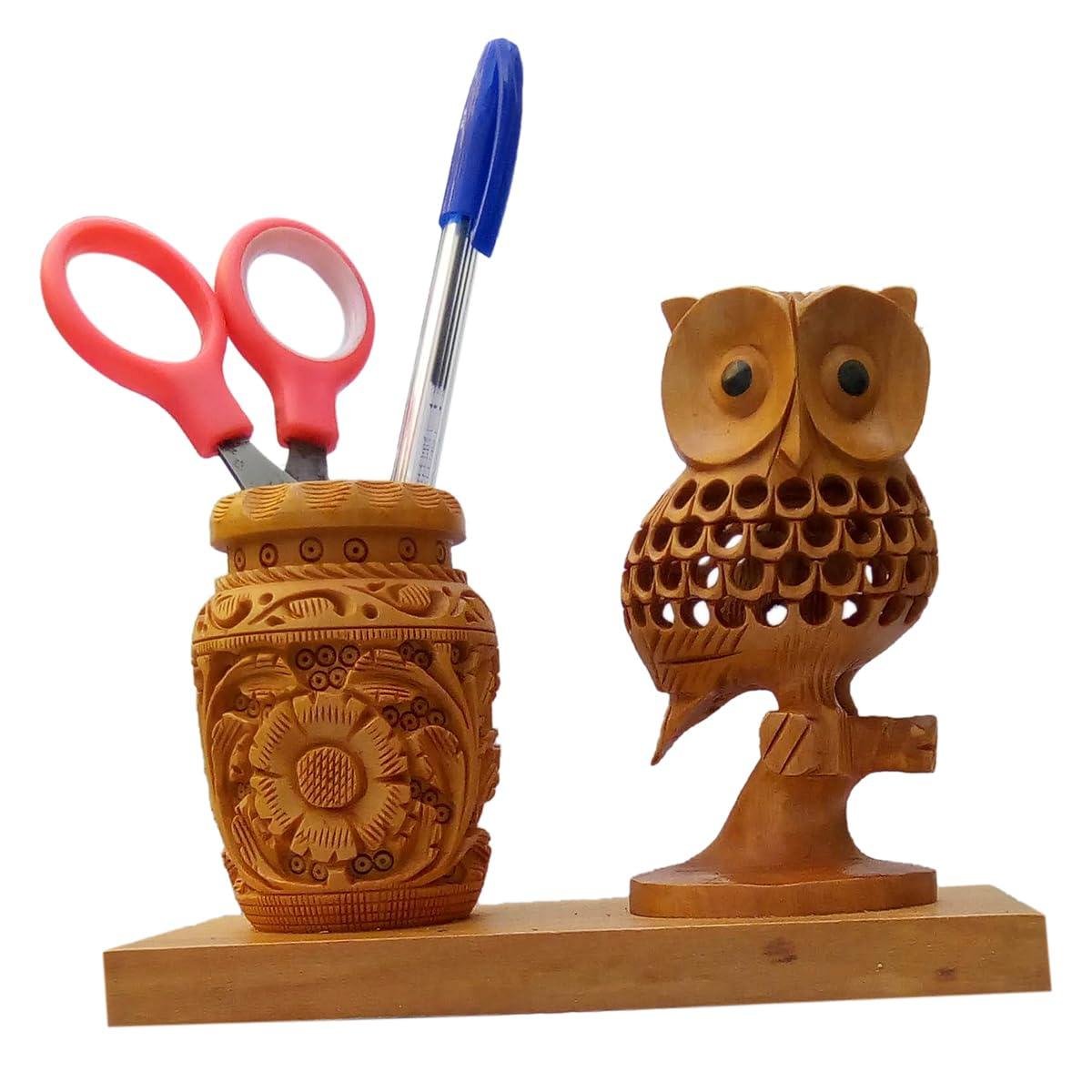 Handcrafted Wooden Pen Holder & Desk Organizer with Ashoka Pillar & Indian Flag