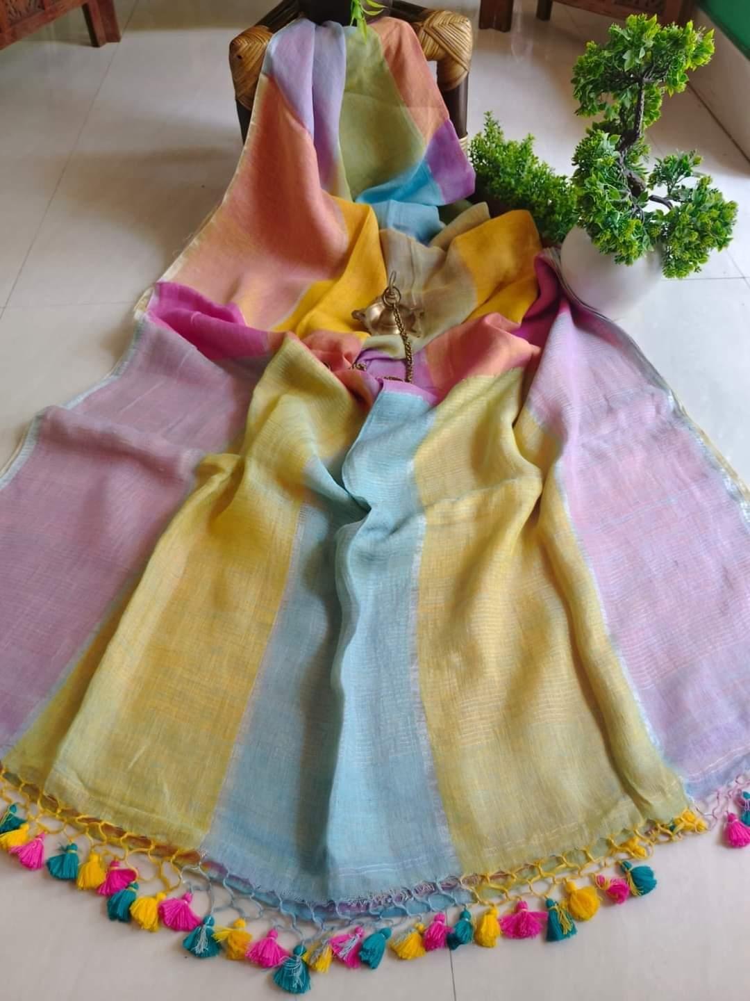 Handcrafted Pure Linen Check Saree in Soft Pastel Shades with Blouse Piece