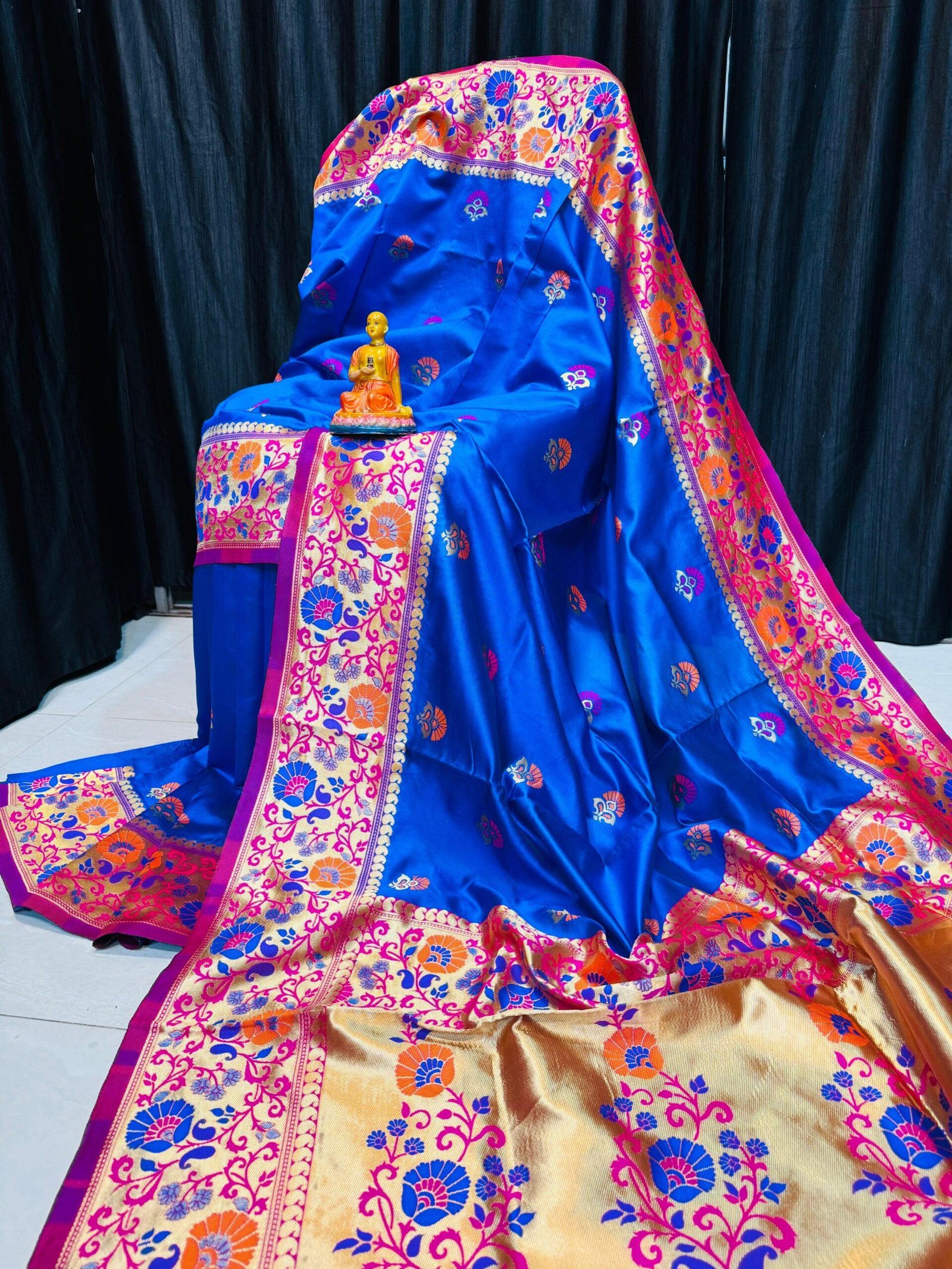 Handcrafted Royal Blue Khadi Paithani Silk Saree with Rich Gold Zari Border & Multicolor Meena Work