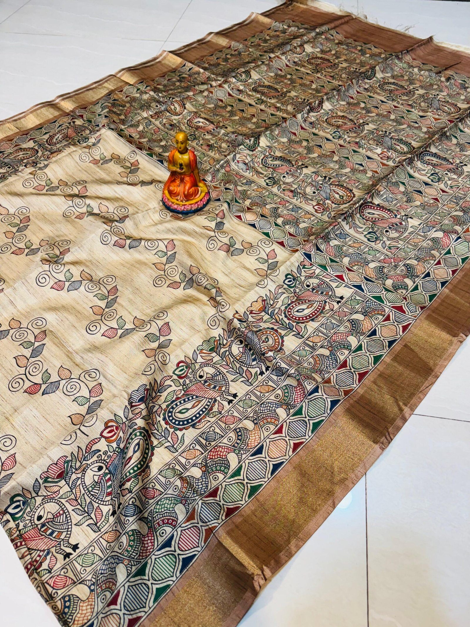 Handcrafted Tussar Silk Saree with Madhubani-Inspired Birds & Floral Vines – Beige with Bronze Elegance