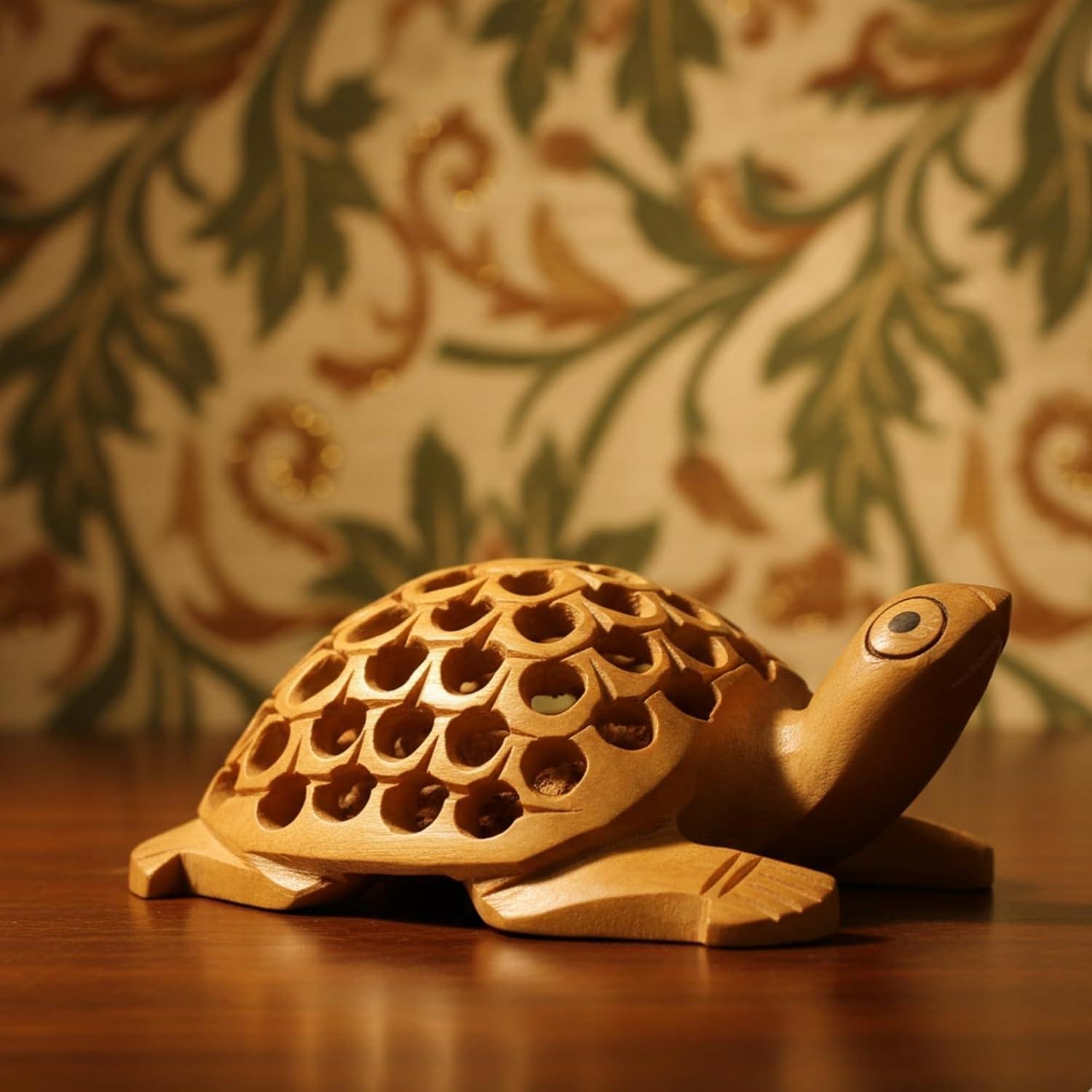 - HANDCRAFTED DESIGN: Beautiful wooden turtle figurine featuring intricate jali (lattice) pattern carving on the shell, showcasing exceptional artisanal craftsmanship