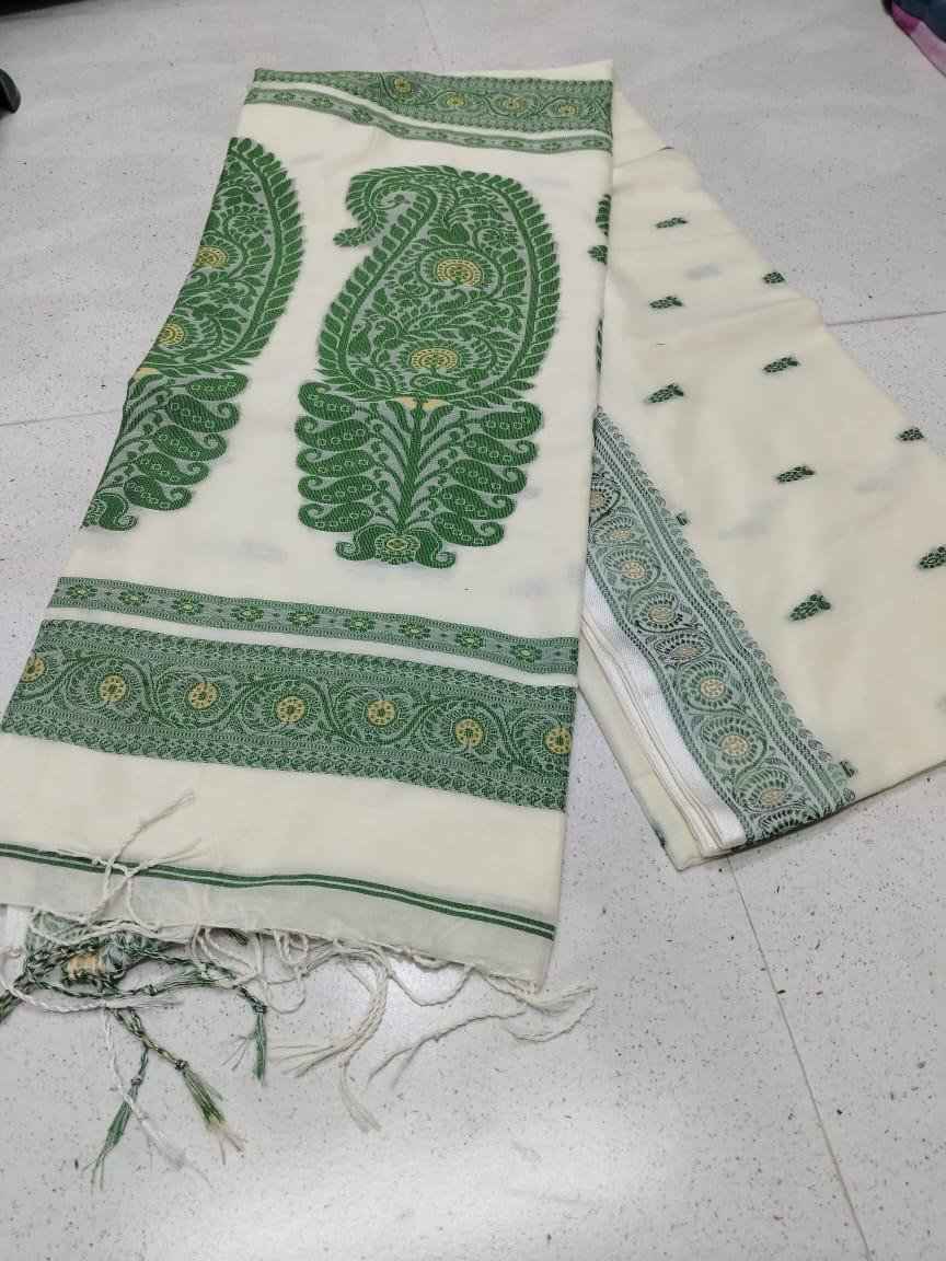 Handwoven Cream & Green Baluchari Saree in Premium Cotton Maslight with Blouse Piece