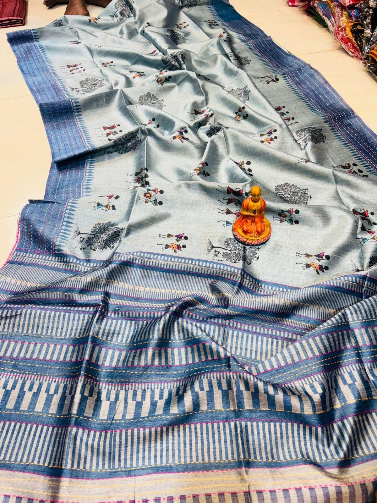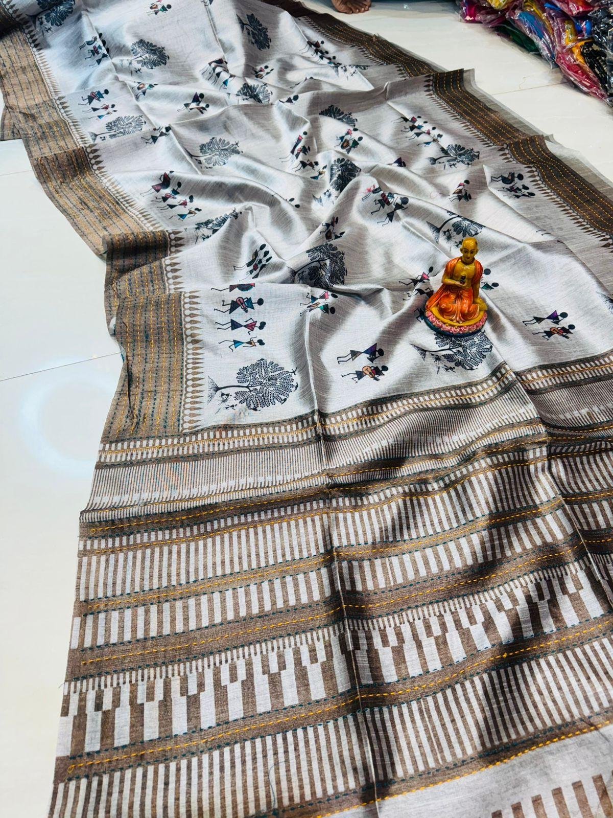Elegant cream off-white Katha silk saree adorned with all-over printed tribal motifs featuring village dancers, trees, peacocks, and folk figures in vibrant multicolors.