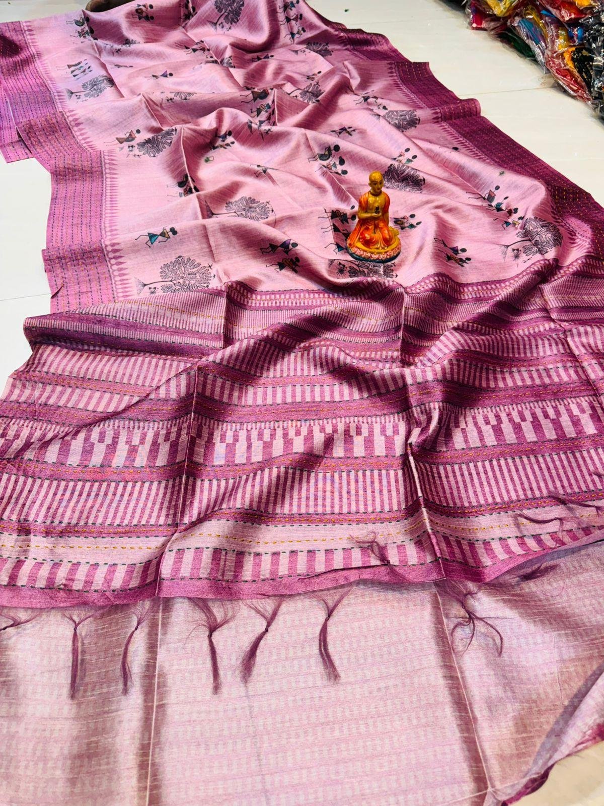 Delicate soft pink Katha silk saree scattered with elegant printed floral blooms, trees, and peacock motifs in deeper maroon and navy hues.