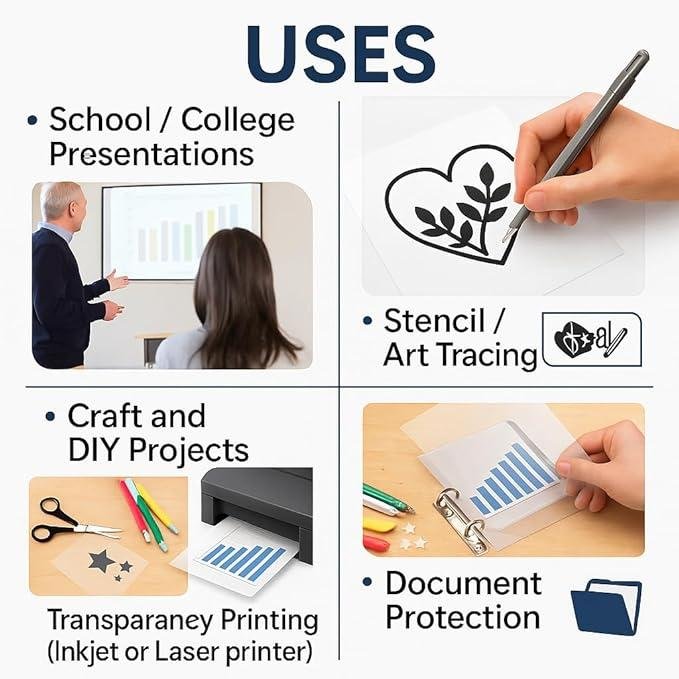 - Uses of OHP sheets :- Presentation Visuals, Education and Training, Transparency and Clarity, Interactivity, Visual aids write in proper
