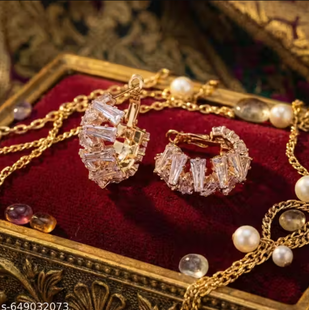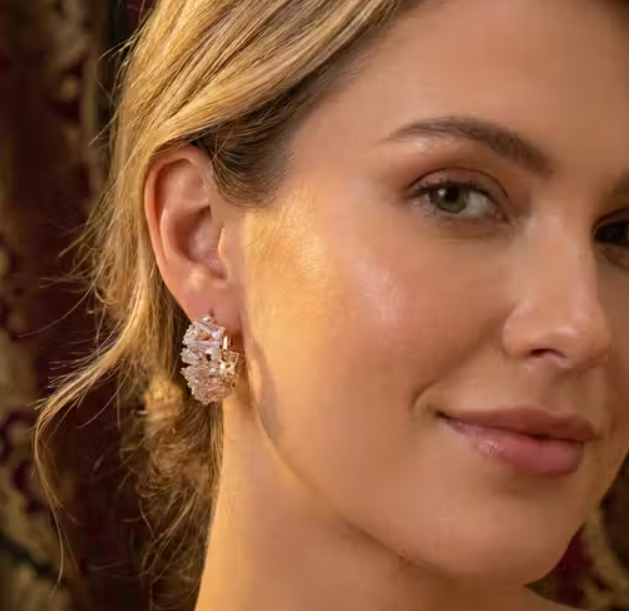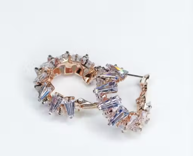 Elevate your party look with these luxury rose gold hoop earrings, featuring sparkling baguette crystals and a premium non-tarnish finish. Designed to combine modern elegance with timeless charm, these hoops are perfect for evening parties, festive occasions, or special events. Lightweight yet striking, they make a sophisticated statement while ensuring long-lasting shine.