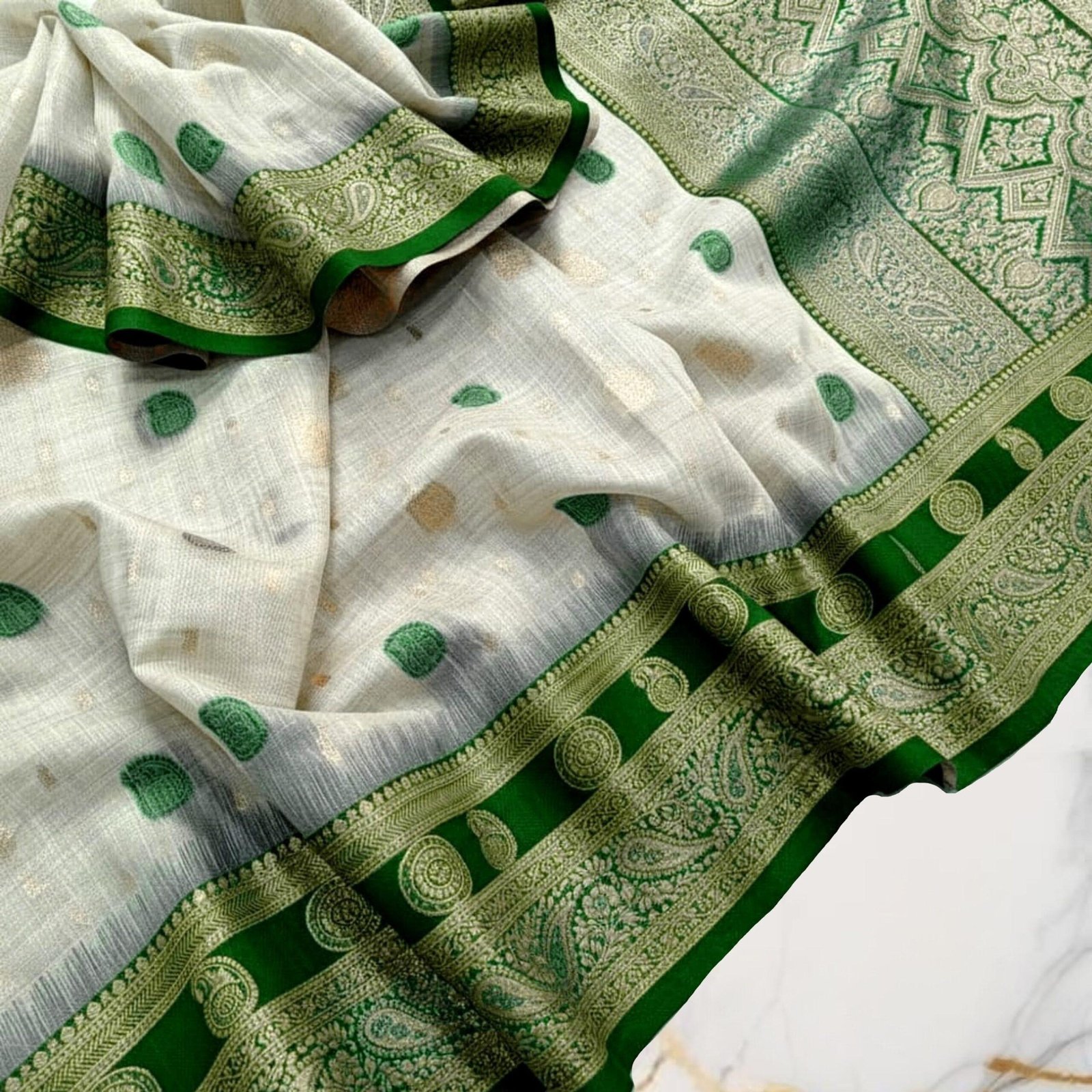 The highlight lies in its bold red contrast border, richly woven with intricate antique gold zari paisley and traditional motifs, creating a striking yet harmonious balance against the pastel base. The pallu carries elaborate zari detailing, enhancing the saree’s regal appeal and making it stand out effortlessly.