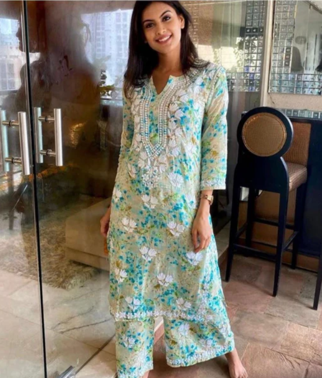 ISHANI Mulmul Cotton Printed Green Chikankari Kurta Palazzo Set