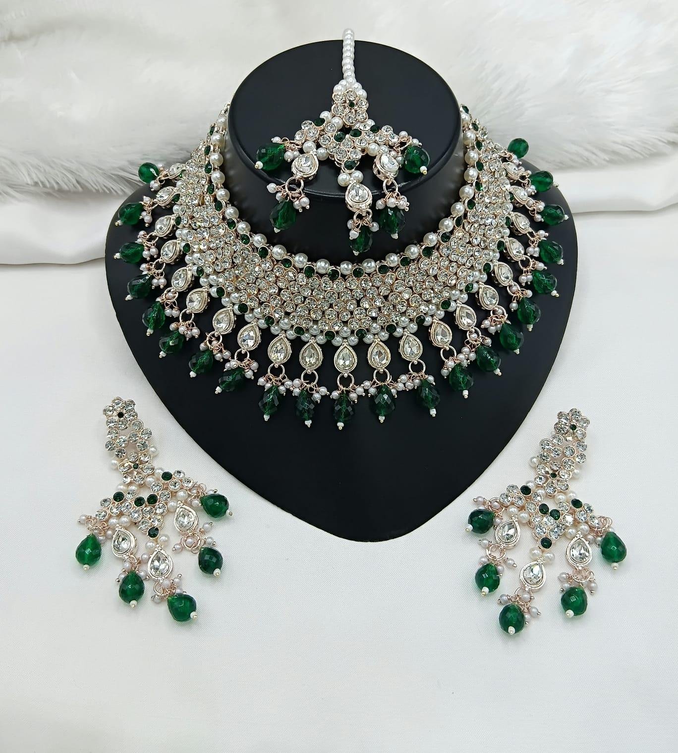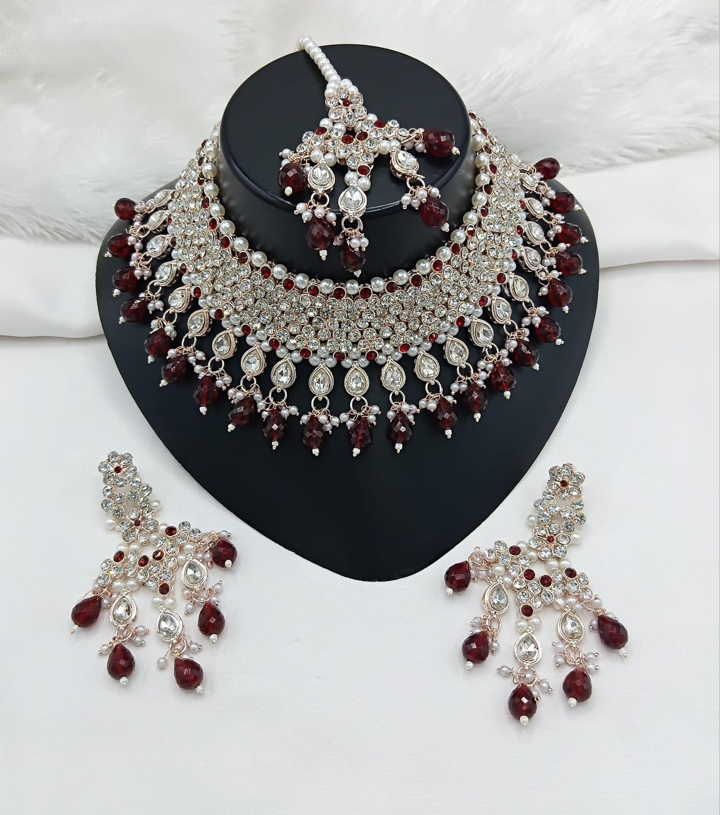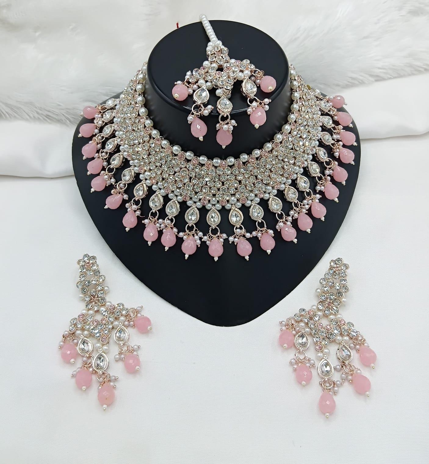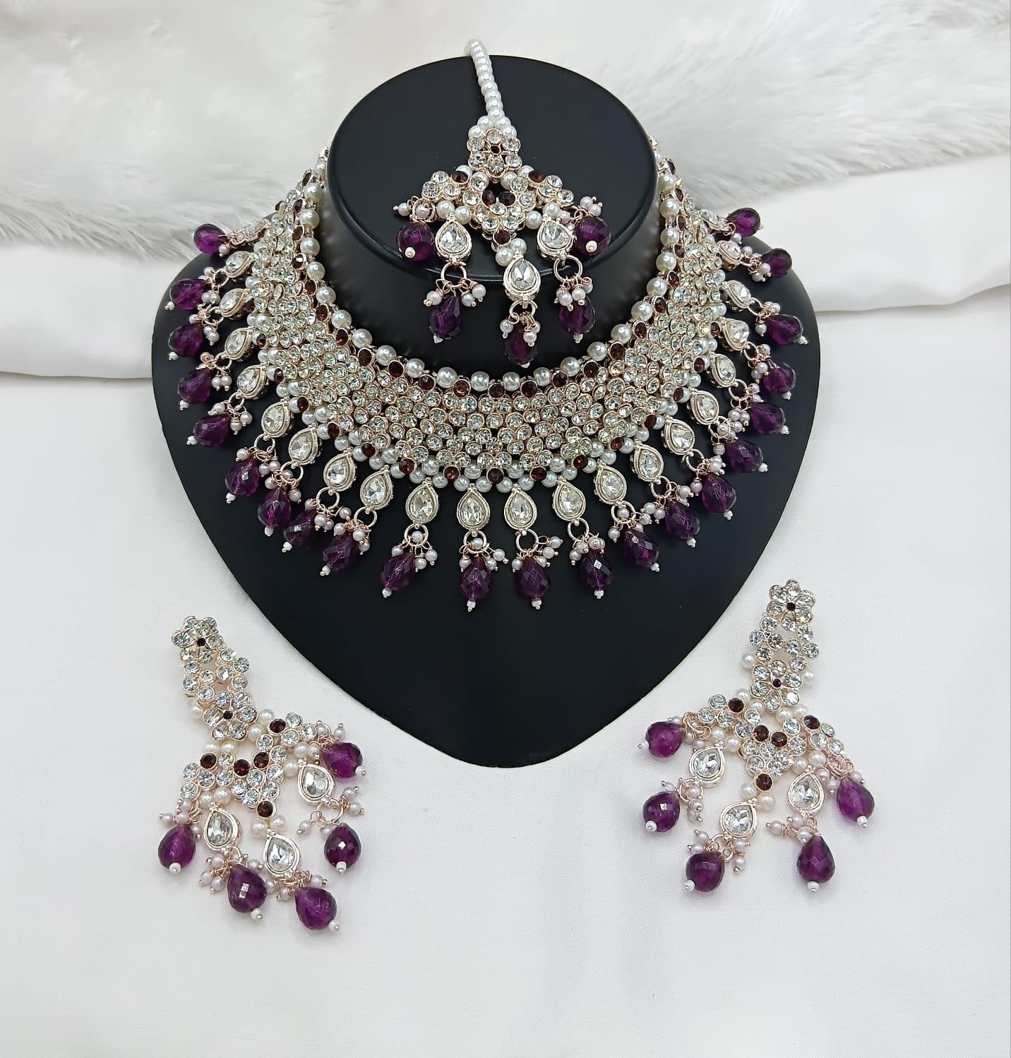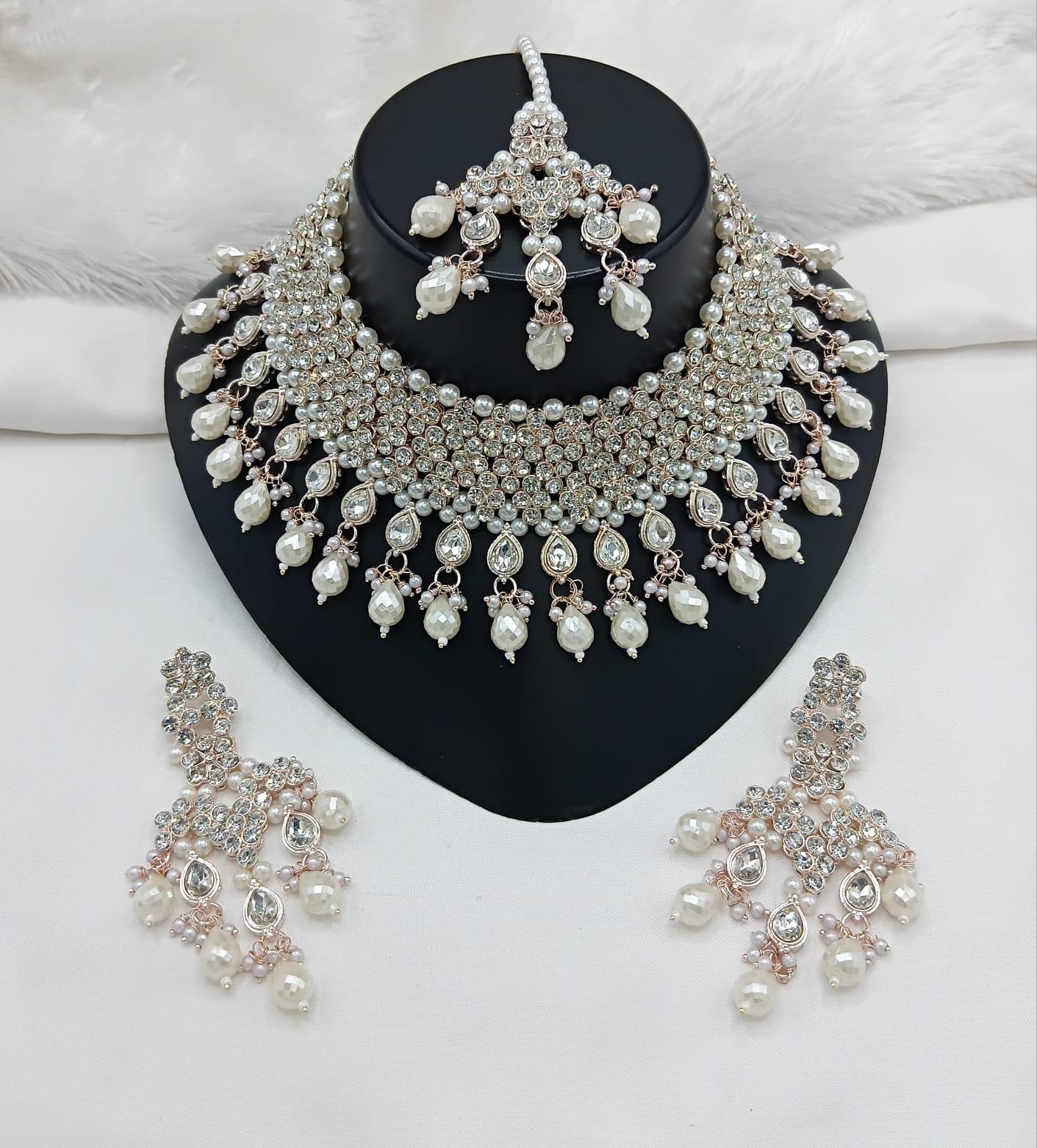 An opulent bridal necklace set crafted to make a timeless statement. This exquisite piece features a richly layered choker-style necklace adorned with shimmering kundan-style stones, delicate crystal detailing, and elegant ivory pearl drops. The intricate craftsmanship creates a regal silhouette that sits beautifully on the neckline. Paired with matching statement earrings and a coordinating maang tikka, this set is perfect for weddings, receptions, and grand festive occasions. Designed to complement both traditional and contemporary ensembles, it adds a touch of royal elegance and luxurious charm to any look.