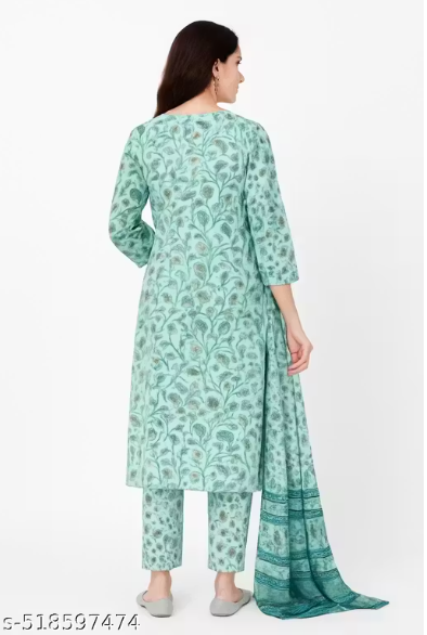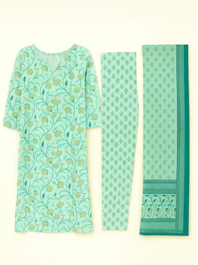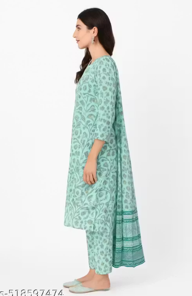 This green cotton kurta set with pants and dupatta is the perfect choice for festive and party occasions. The A-line calf-length kurta features a vibrant floral print with delicate embroidery, creating an elegant and timeless look. Paired with matching cotton pants and a soft cotton dupatta, this stitched, ready-to-wear set ensures both comfort and style. The round neck, three-quarter sleeves, and breathable cotton fabric make it ideal for celebrations, family gatherings, or casual festive wear.