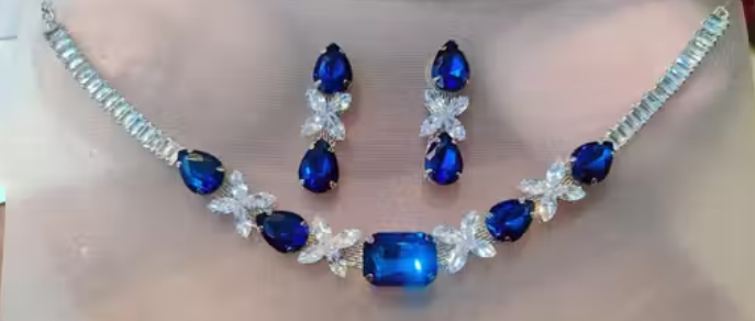Jewellery Navy Blue American Diamond Necklace Set with Stud Earrings For Women & Girls