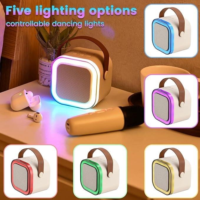 - Small Body, Powerful Sound The mini karaoke machine has powerful and clear sound, our speakers will provide you with deep bass and crisp treble, with dual speakers, strong three dimensional effect and has the feature of LED light ,Fill the atmosphere of singing