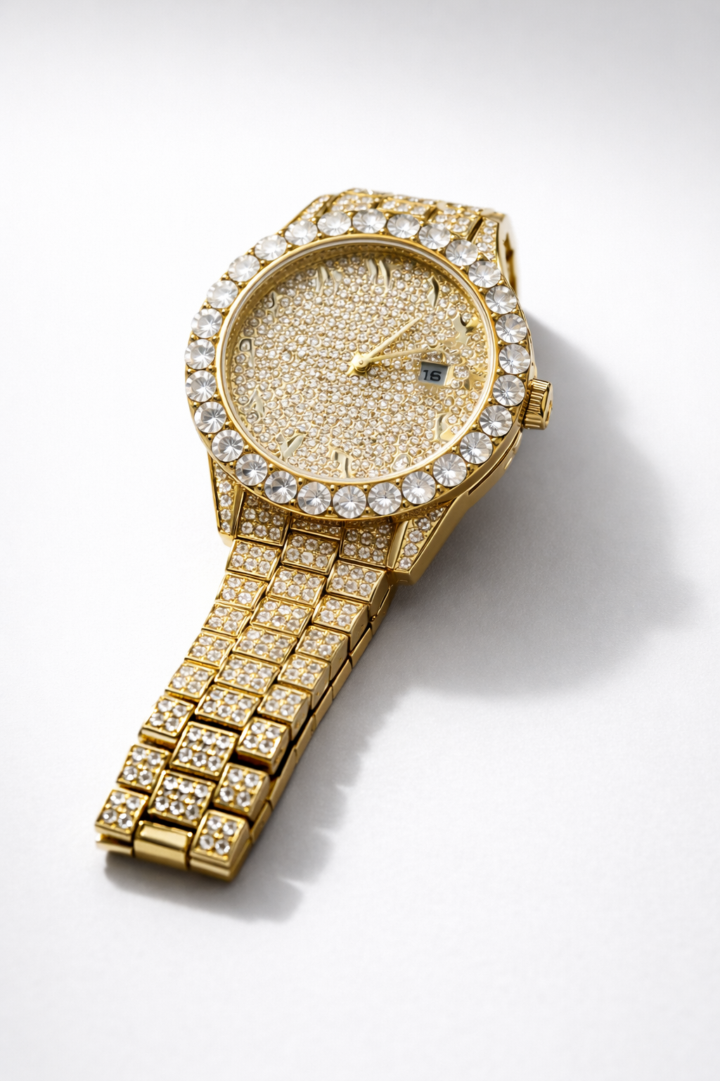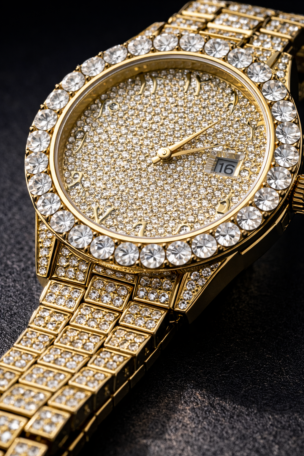 The gold-finished metal bracelet, detailed with precision-set crystals, offers a strong yet comfortable fit on the wrist. Its solid construction ensures durability, while the secure clasp provides confidence throughout the day or night. The watch is carefully balanced to feel premium without being bulky.