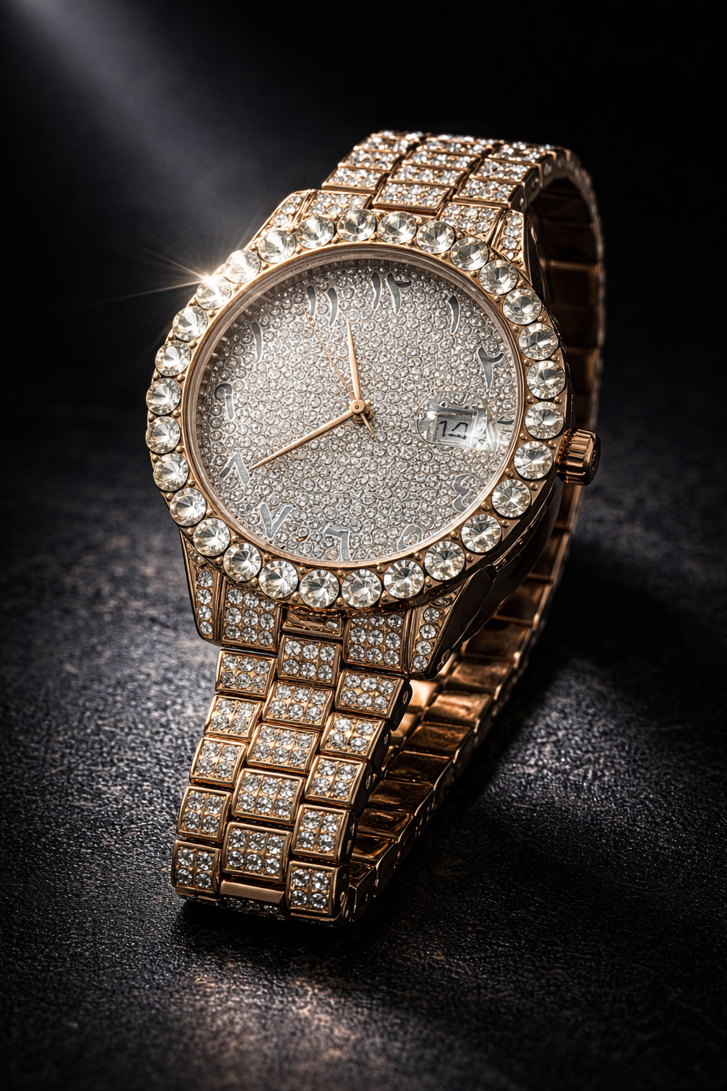 The gold-finished metal bracelet, detailed with precision-set crystals, offers a strong yet comfortable fit on the wrist. Its solid construction ensures durability, while the secure clasp provides confidence throughout the day or night. The watch is carefully balanced to feel premium without being bulky.