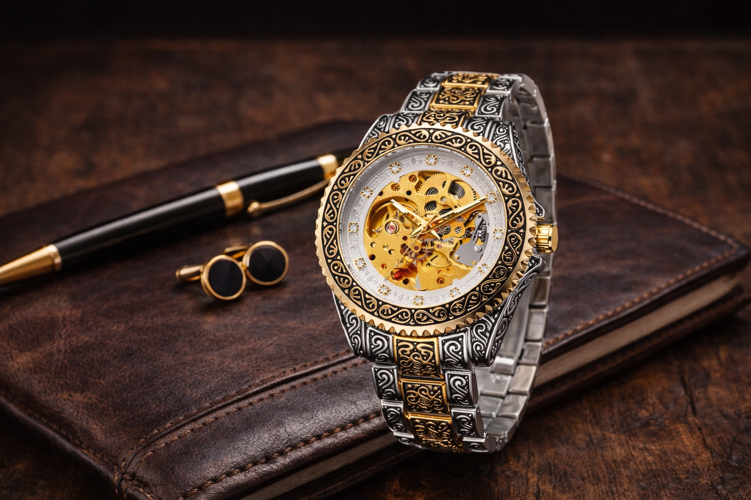 Crafted with a durable metal case, premium finishes, and a carefully detailed dial, this timepiece balances robustness with elegance. Its classic analog display, combined with a modern skeleton-style design, makes it suitable for both formal occasions and everyday wear.