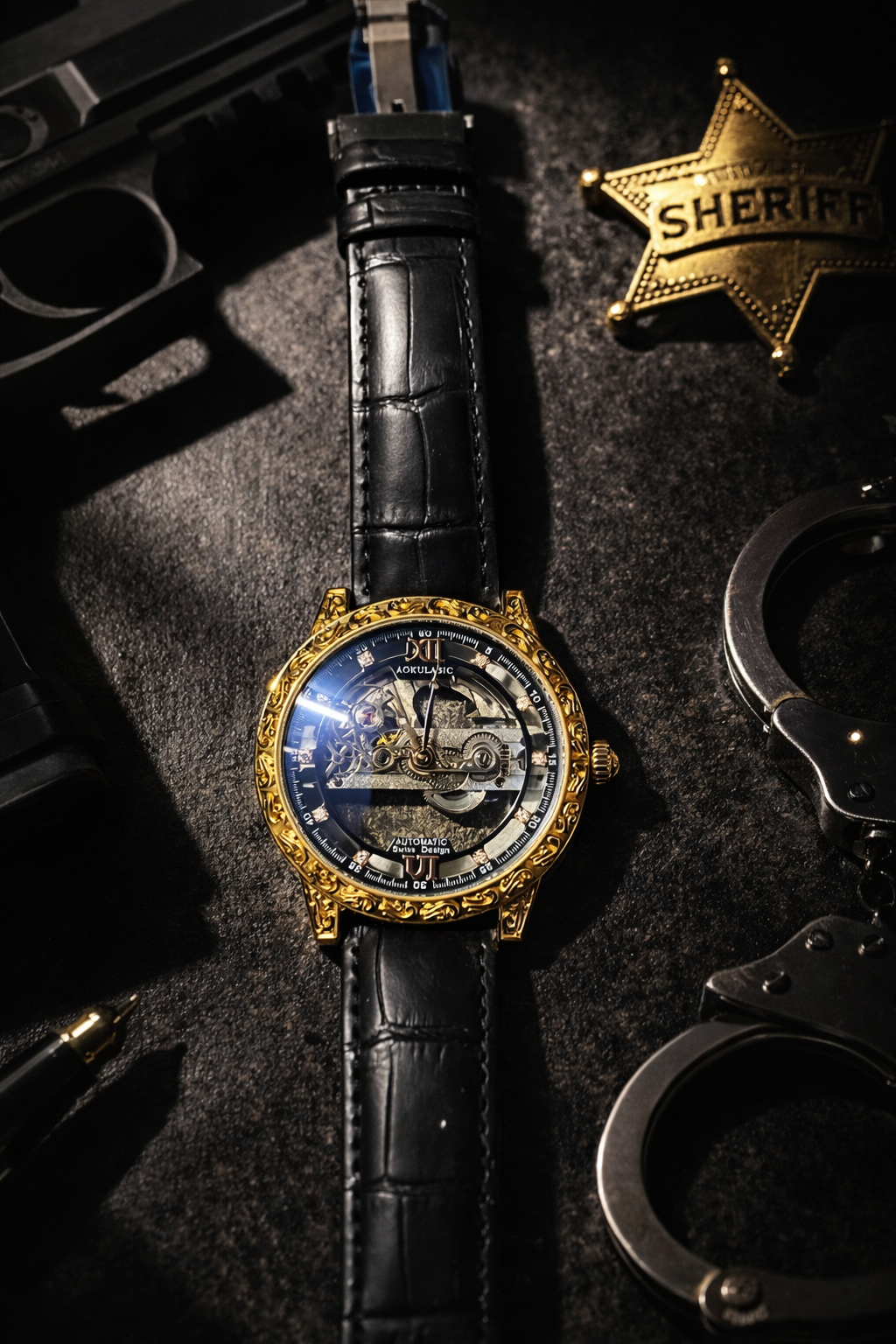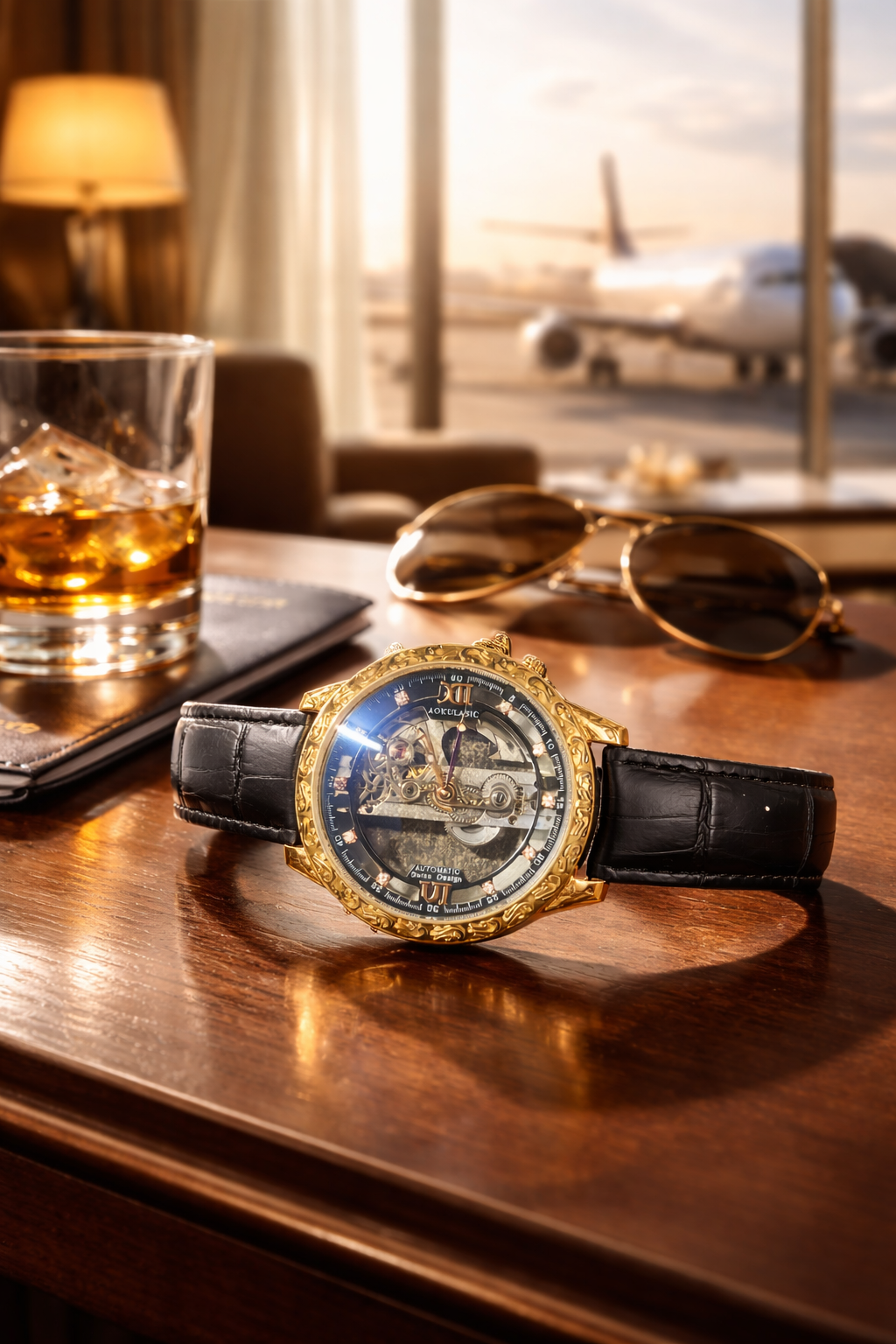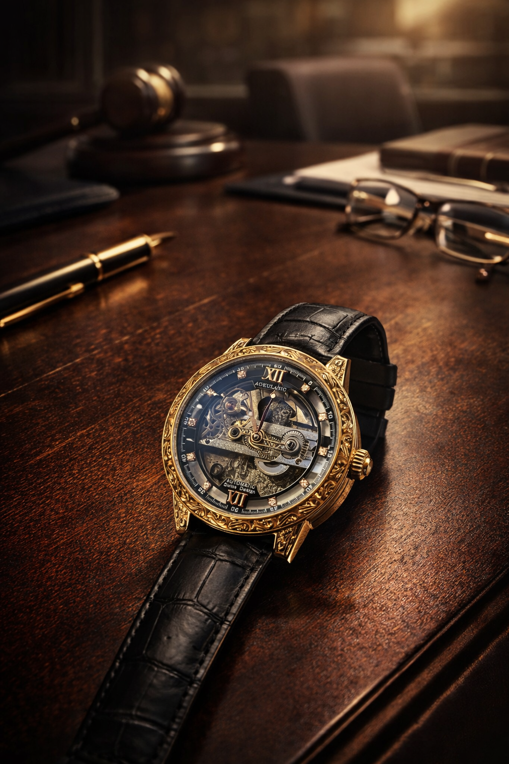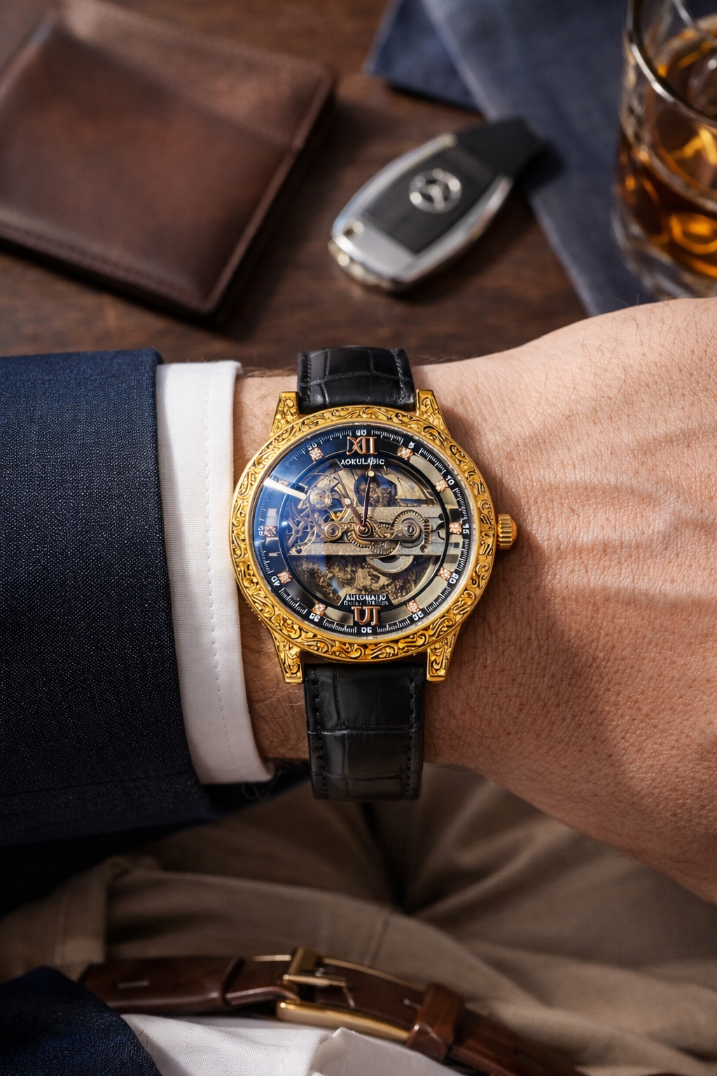 Crafted with a durable metal case, premium finishes, and a carefully detailed dial, this timepiece balances robustness with elegance. Its classic analog display, combined with a modern skeleton-style design, makes it suitable for both formal occasions and everyday wear.