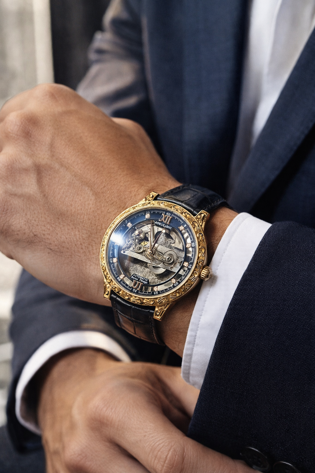 Powered by a fully automatic mechanical movement, the watch operates without batteries, drawing energy from your natural wrist movement. The transparent case back reveals the intricate inner mechanism, highlighting the craftsmanship, balance wheel, and synchronized gear system that define true horological excellence.