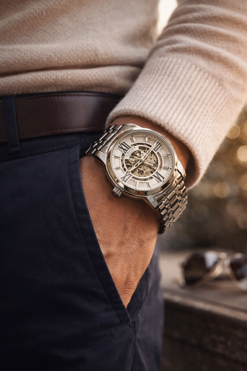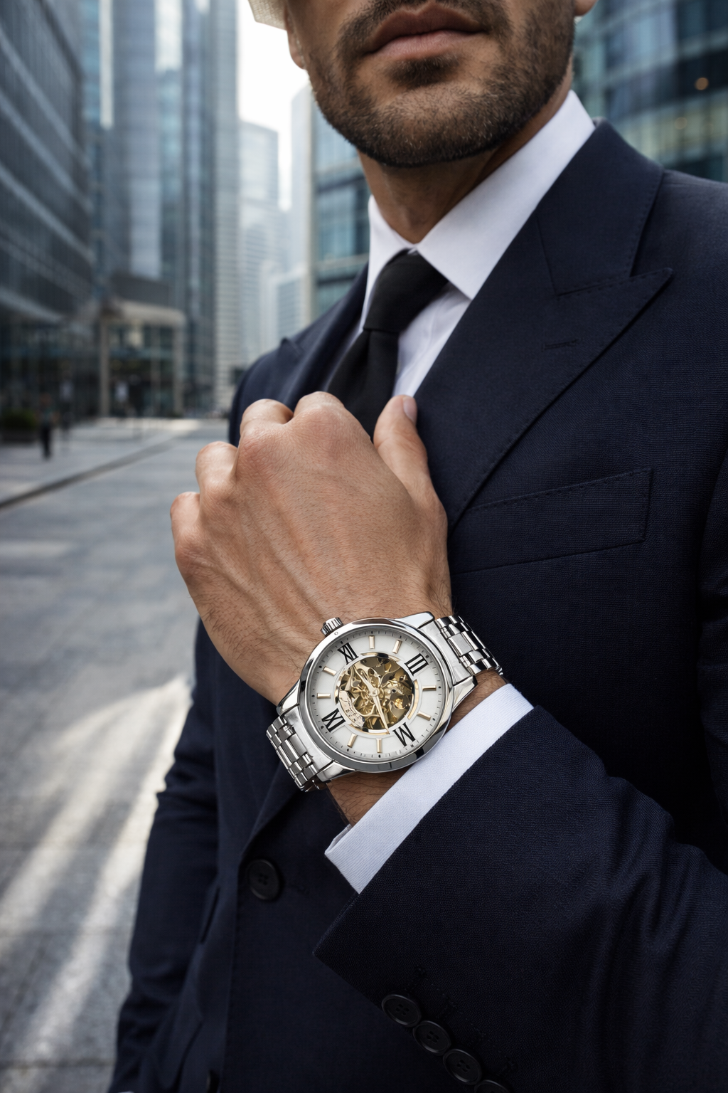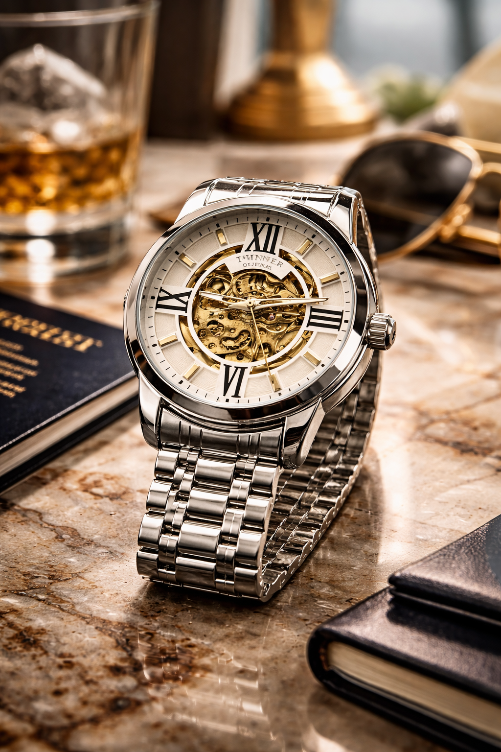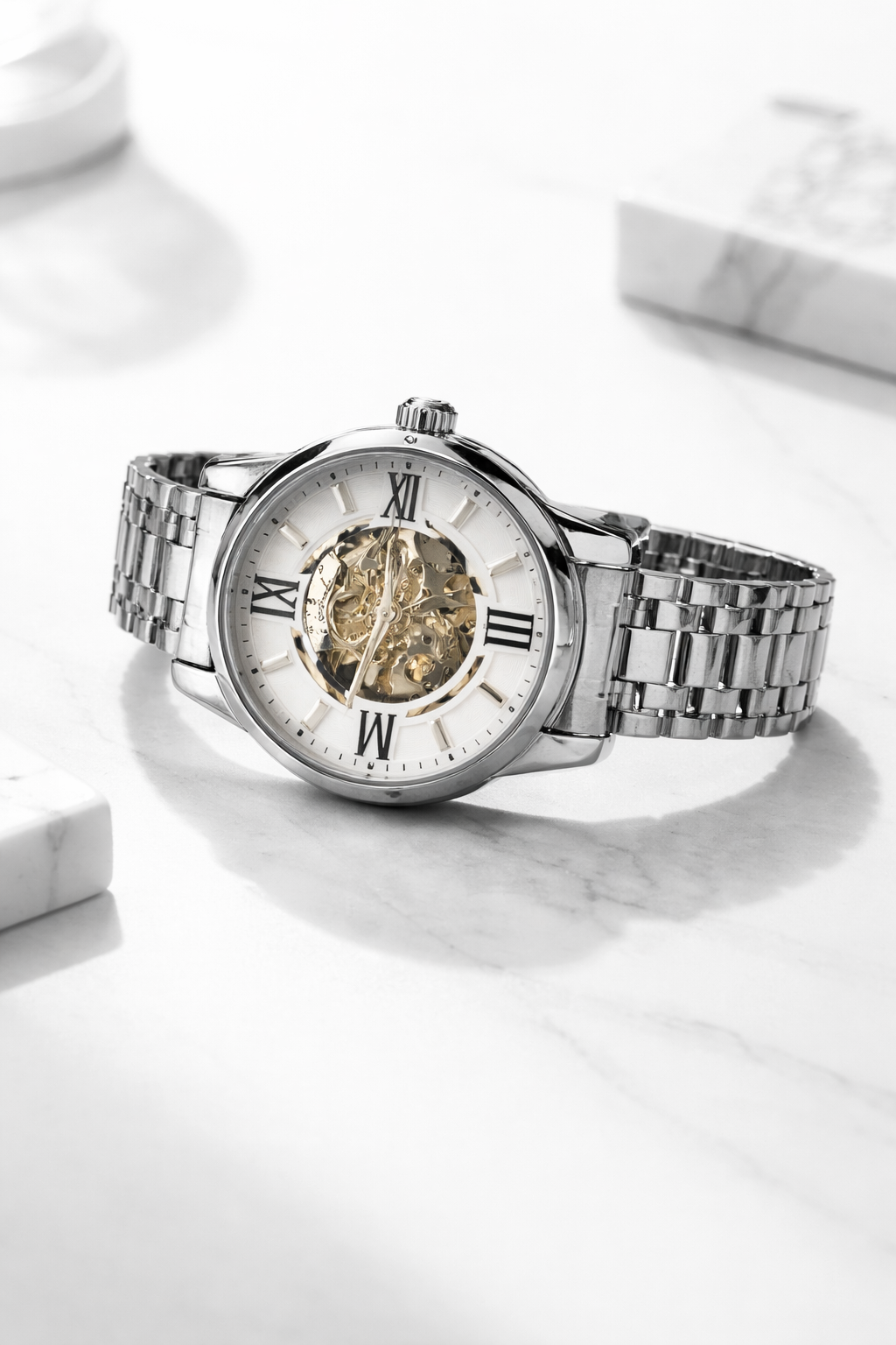 Crafted with a durable metal case, premium finishes, and a carefully detailed dial, this timepiece balances robustness with elegance. Its classic analog display, combined with a modern skeleton-style design, makes it suitable for both formal occasions and everyday wear.