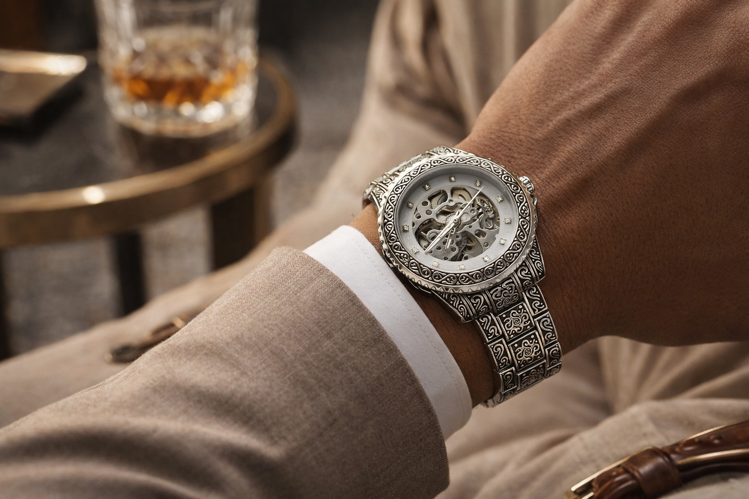 Crafted with a durable metal case, premium finishes, and a carefully detailed dial, this timepiece balances robustness with elegance. Its classic analog display, combined with a modern skeleton-style design, makes it suitable for both formal occasions and everyday wear.