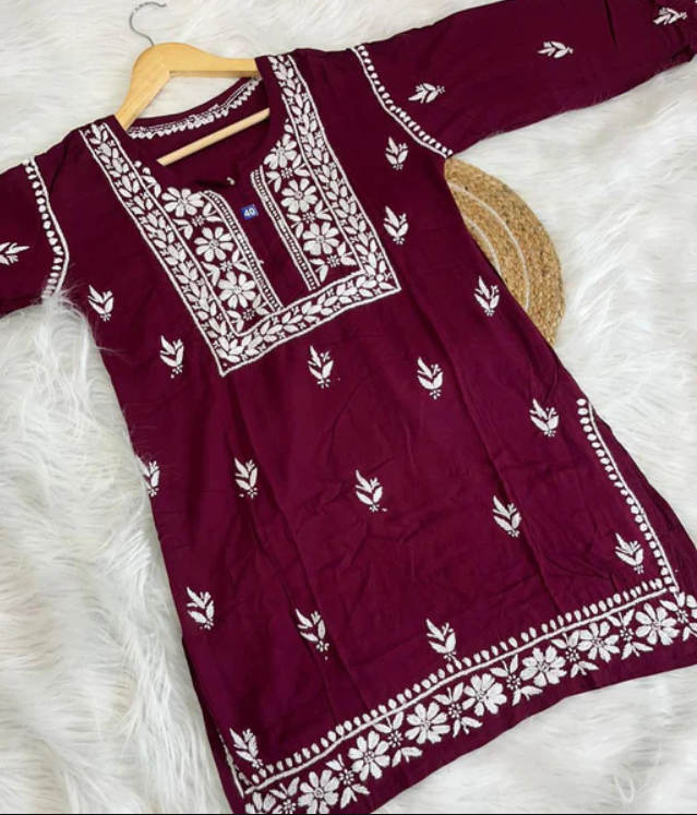 - ✨ Elegant Chikankari Embroidery: Handcrafted white thread detailing on maroon fabric for a refined, timeless appeal.