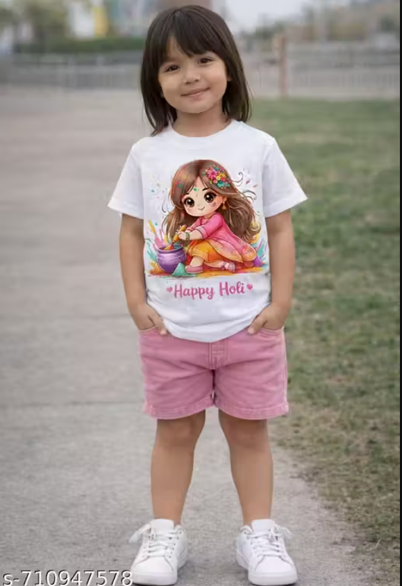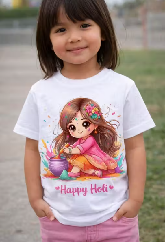 Make your little one’s Holi celebrations extra fun with this Happy Holi printed cotton t-shirt for girls. Crafted from soft, breathable white cotton, this kids festival tee features a cute cartoon Holi print that adds color and joy to the festive look. Designed for comfort and easy movement, it’s perfect for Holi celebrations, school events, or casual wear.