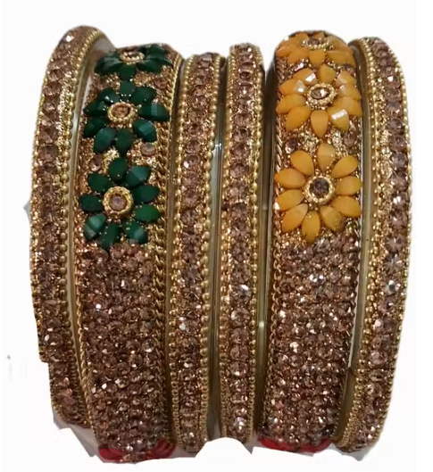 Lac Bangles Set, Floral Lac Bangles, Green Yellow Bangles, Stone Studded Lac Jewelry, Wedding Lac Bangles For Women, Party Wear Lac Bangles, Indian Traditional Lac Bangles, Handmade Lac Jewelry Set