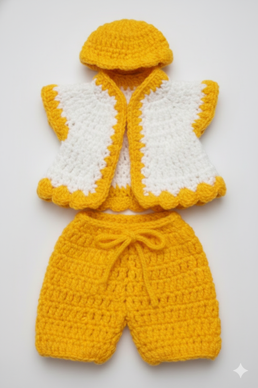 This handcrafted crochet set is perfect for keeping Laddu Gopal warm and stylish during the winter season. Designed with soft, high-quality wool, it ensures both comfort and a divine look for your deity.