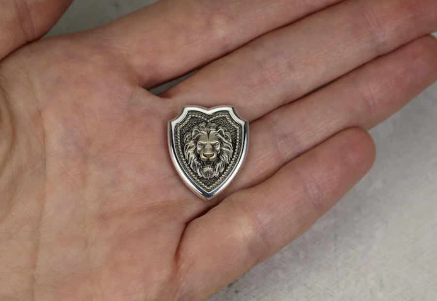 Crafted from sterling silver , this striking lion head shield pin brooch merges medieval aesthetics with refined craftsmanship. The commanding lion visage, rendered in intricate detail, captures both strength and elegance—ideal for lapel wear or as a distinctive jewelry accessory. Perfect for collectors of heraldic pieces, history enthusiasts, or those seeking a bold statement accessory. The substantial weight and superior silver composition ensure durability and lasting luster. An exceptional choice for formal occasions, costume events, or everyday wear that demands sophistication and character.