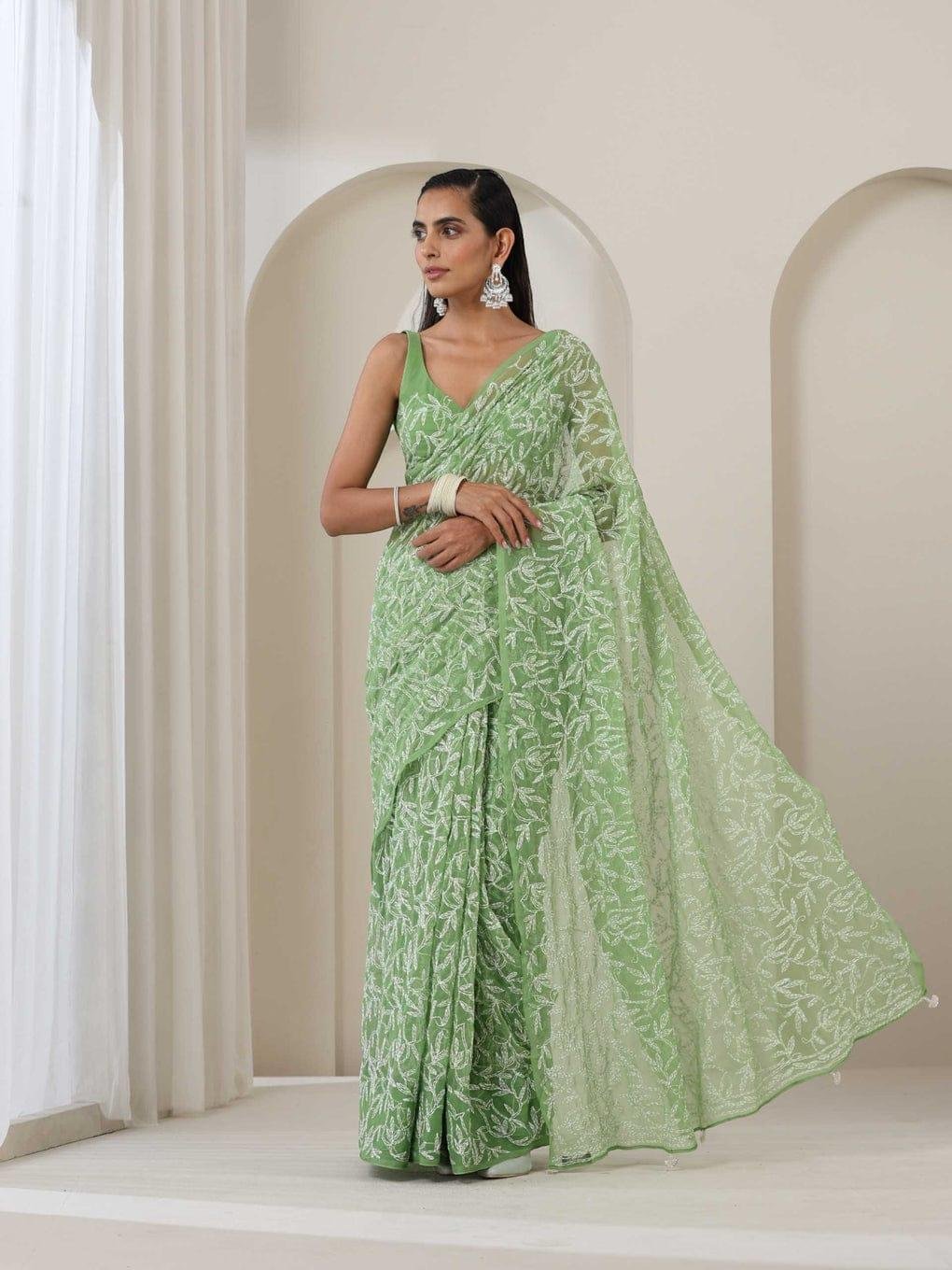 Elegant chiffon tapchi saree which always remains a favorite of people in demand due to its high workmanship Lucknowi’s famous chikankari work and tapchi thread which gives a different, lovely feeling after wearing. Since the fabric is chiffon, it will be more comfortable in summer season.