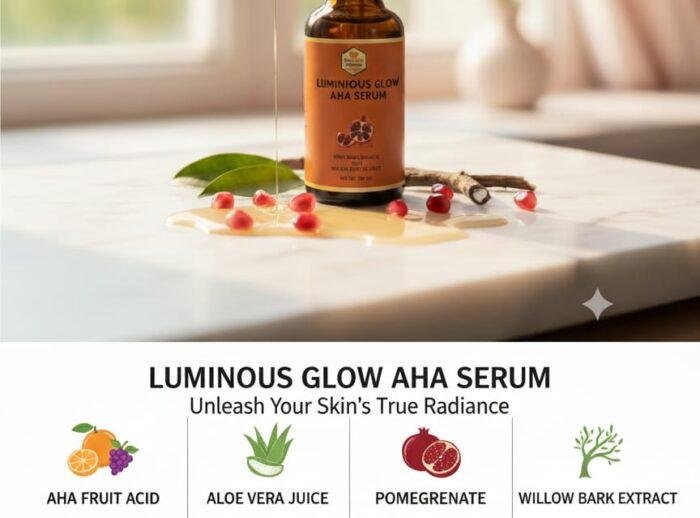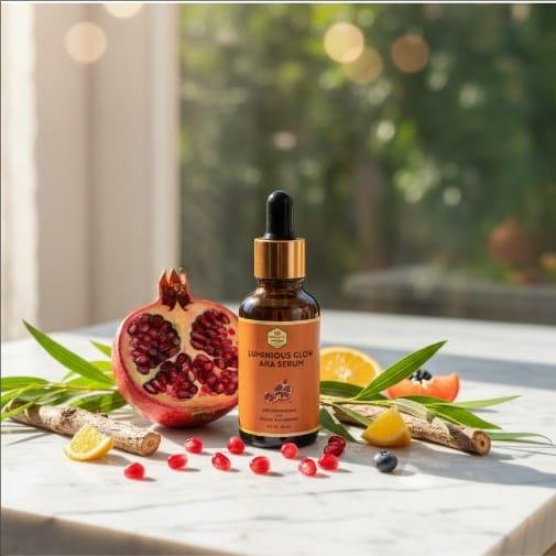 Unveil visibly brighter and smoother skin with Luminous Glow AHA Serum — a rejuvenating blend of AHA Fruit Acids, Pomegranate Extract, and Willow Bark Extract. This powerful yet gentle formula works overnight to exfoliate dead skin cells, unclog pores, reduce pigmentation, and improve skin texture.