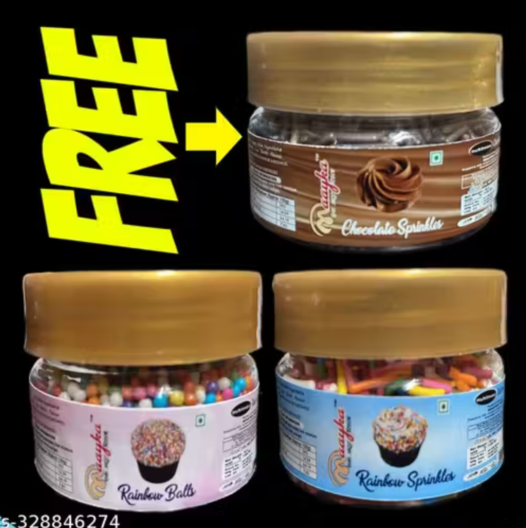 The Maayka Premium Cake Sprinkles Combo is a set of three edible decorative toppings designed to add colour, fun, and flavour to your cakes, cupcakes, cookies, and other desserts. This pack includes rainbow balls, rainbow sprinkles, and chocolate sprinkles — perfect for parties, celebrations, or everyday baking decoration.