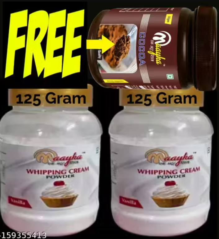 - Vanilla Whipping Cream Powder (2 × 125 g): Two packs of powdered whipping cream mix with vanilla flavour — designed to be whipped into a light, creamy topping for cakes, pastries, cupcakes, and more.