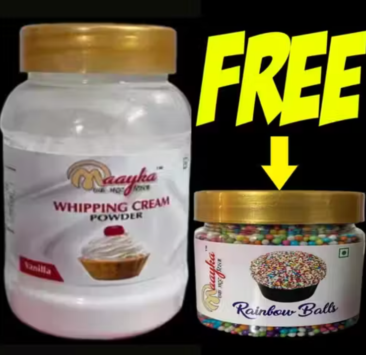 Maayka Premium Vanilla Whipping Cream Powder (125 g) + Free Red Balls Sprinkles (50 g) is a baking and dessert topping mix from Maayka Foods. It’s designed to help you make sweet, creamy whipped topping and easily decorate cakes, cupcakes, pastries, and other desserts at home.