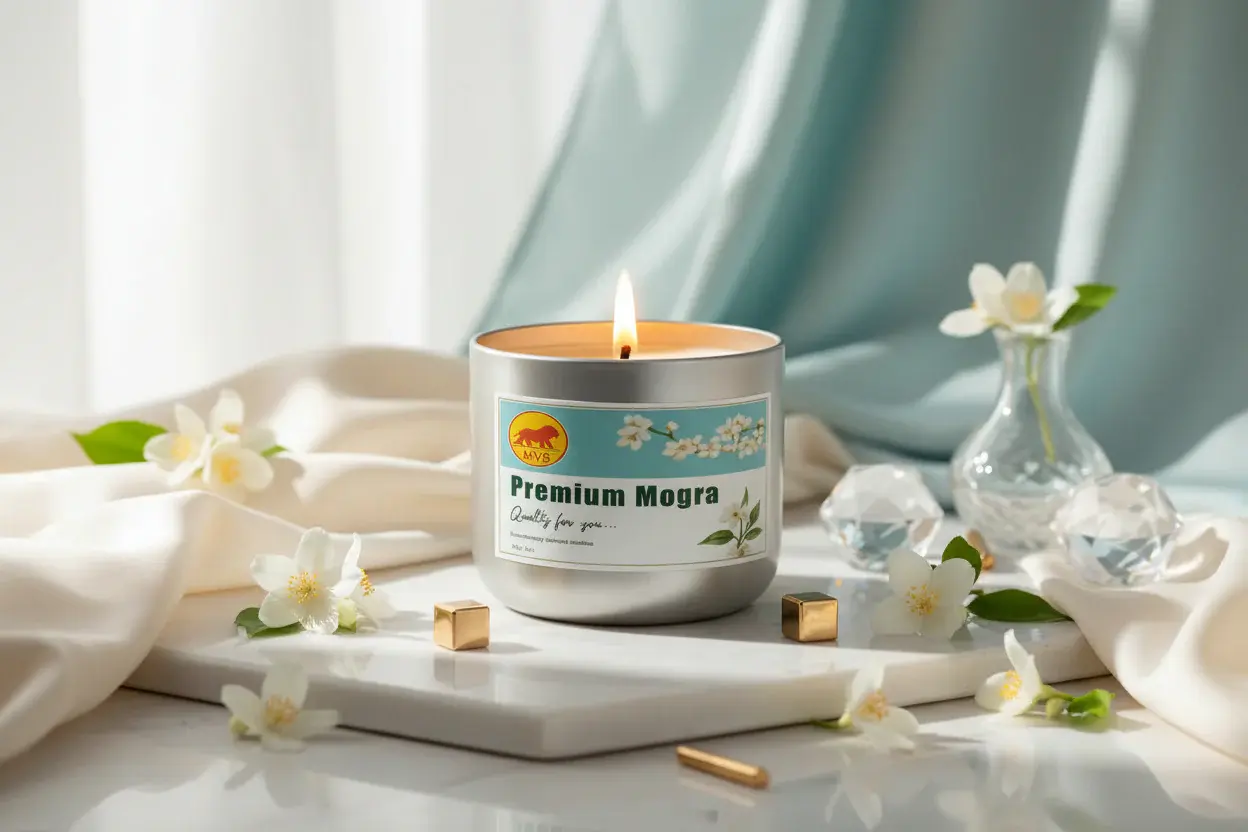 Presenting the MVB Vegan Organic Hand-Poured Pure Soya Wax Candle, beautifully housed in a sleek silver metal jar and filled with the lovely fragrance of Mogra (Jasmine) Essential Oil. A representation of luxury, purity, and sustainable living, this candle is the ideal choice for any room.