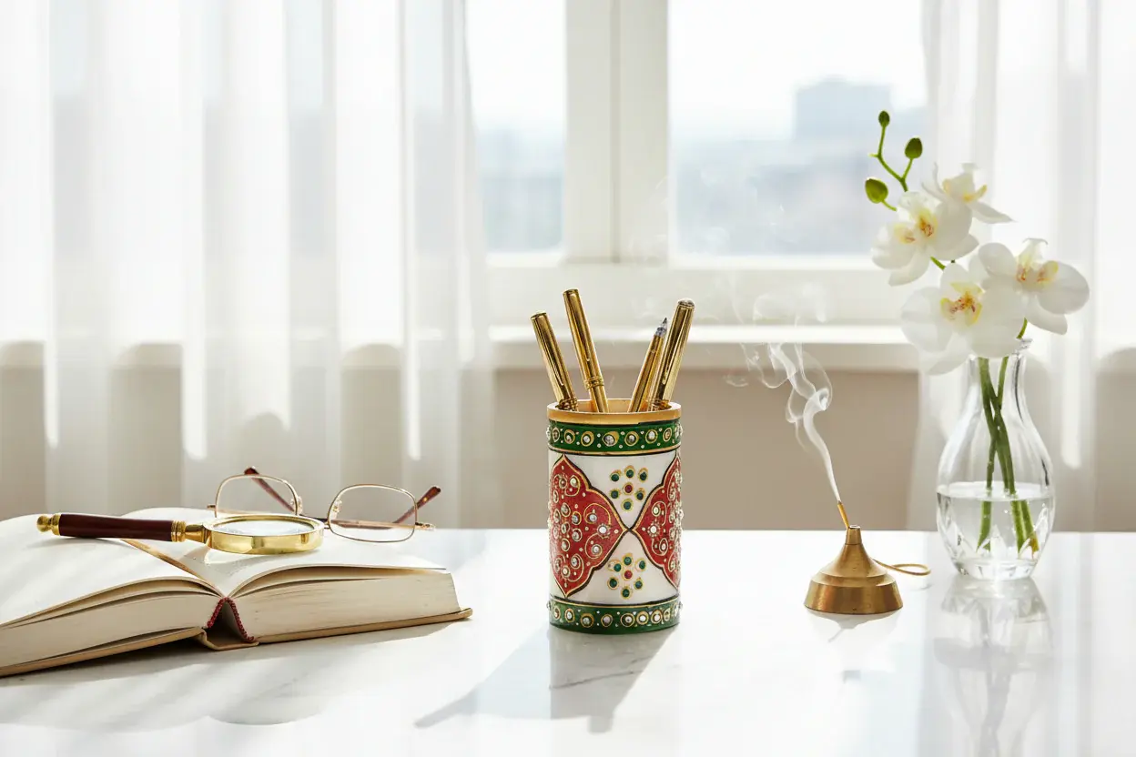 Meenakari is a rare traditional enamel painting artistry characterized by its beautiful floral and geometric motifs. Every pen holder is intricately painted by a master artist, and hence, it is an individual work of art that can add beauty to any interior—you office, study room, or living room.