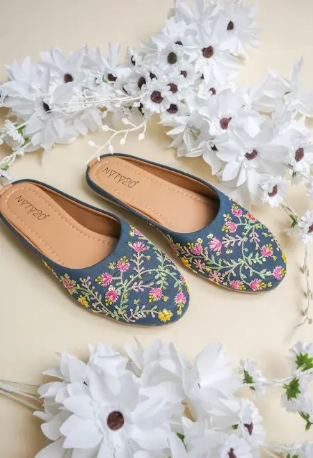 These elegant slip-on flats feature a soft muted blue base adorned with delicate floral embroidery in shades of pink, yellow, and green. The intricate vine-like pattern creates a charming, handcrafted look, while the rounded toe design offers a classic, versatile silhouette. Designed for both comfort and style, the cushioned insole and easy backless design make them perfect for everyday wear, whether you're heading out for a casual outing or adding a subtle statement to a dressed-up look.