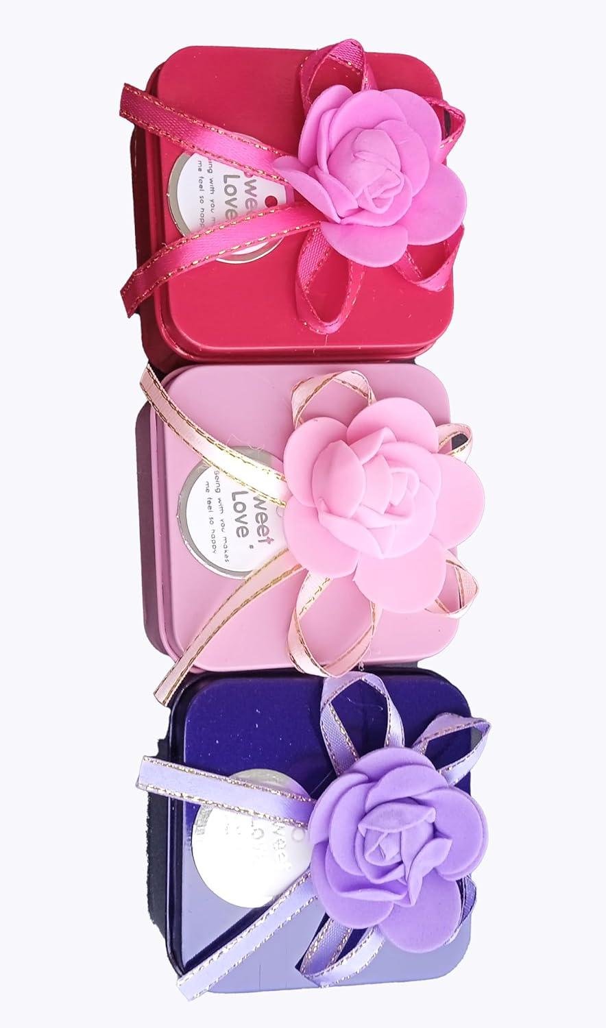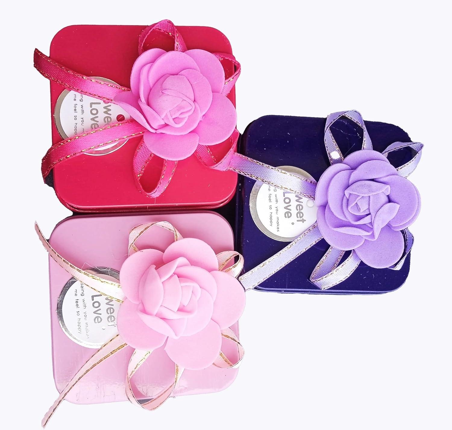 Metal Gift Boxes with Rose and Ribbon, Squared Shape, Set of 3, 6 x 6 x 3.5 cm, Storage Containers for Jewellery and Chocolates