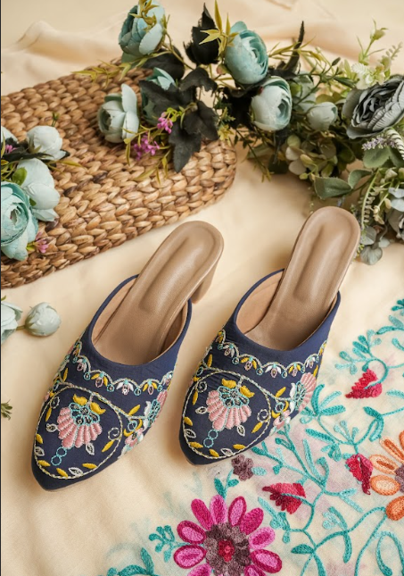These chic mule heels feature a sleek blue base beautifully accented with intricate multicolor floral embroidery, creating a striking contrast that feels both elegant and lively. The pointed-toe design adds a touch of sophistication, while the low block heel offers comfortable lift for all-day wear. With a smooth cushioned insole and easy slip-on style, these mules are perfect for elevating casual outfits or complementing semi-formal looks with a graceful, feminine flair.