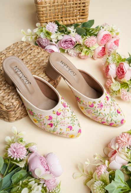 These chic mule heels feature a sleek cream base beautifully accented with intricate multicolour floral embroidery, creating a striking contrast that feels both elegant and lively. The pointed-toe design adds a touch of sophistication, while the low block heel offers comfortable lift for all-day wear. With a smooth cushioned insole and easy slip-on style, these mules are perfect for elevating casual outfits or complementing semi-formal looks with a graceful, feminine flair.