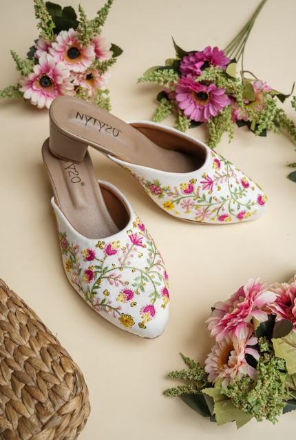 These chic mule heels feature a sleek white base beautifully accented with intricate multicolor floral embroidery, creating a striking contrast that feels both elegant and lively. The pointed-toe design adds a touch of sophistication, while the low block heel offers comfortable lift for all-day wear. With a smooth cushioned insole and easy slip-on style, these mules are perfect for elevating casual outfits or complementing semi-formal looks with a graceful, feminine flair.