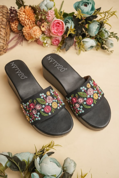 Add a touch of vibrant charm to your everyday style with these black slide sandals, beautifully accented with colorful floral embroidery. Designed with a smooth, cushioned footbed and a subtle wedge sole, they offer both comfort and durability for all-day wear. The wide strap showcases intricate multicolor threadwork inspired by blooming gardens, creating a striking contrast against the deep black base. Easy to slip on and effortlessly stylish, these sandals are perfect for casual outings, summer strolls, or adding a pop of color to minimalist outfits.
