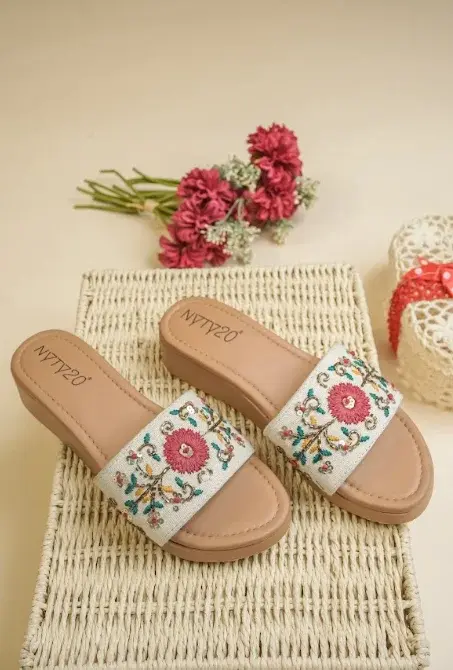 Add a touch of vibrant charm to your everyday style with these black slide sandals, beautifully accented with colorful floral embroidery. Designed with a smooth, cushioned footbed and a subtle wedge sole, they offer both comfort and durability for all-day wear. The wide strap showcases intricate multicolor threadwork inspired by blooming gardens, creating a striking contrast against the deep black base. Easy to slip on and effortlessly stylish, these sandals are perfect for casual outings, summer strolls, or adding a pop of color to minimalist outfits.