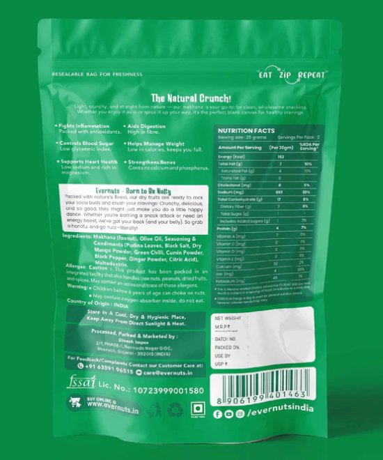 Buy Minty Pudina Makhana Online from EverNuts — light fox nuts roasted to a perfect crunch and coated with a refreshing pudina seasoning that instantly cools things down.