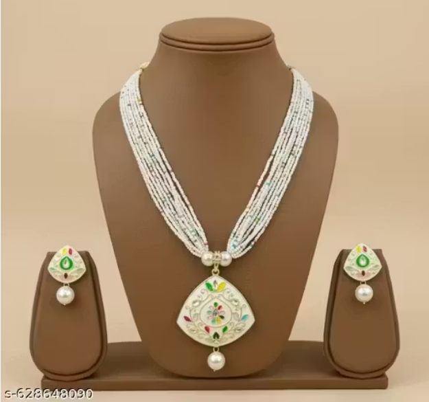 Elevate your ethnic look with this multi-layered pearl necklace set featuring a beautifully crafted enamel pendant and matching earrings. Perfect for weddings, festive occasions, and traditional events, this set combines classic pearl elegance with colorful enamel artistry.