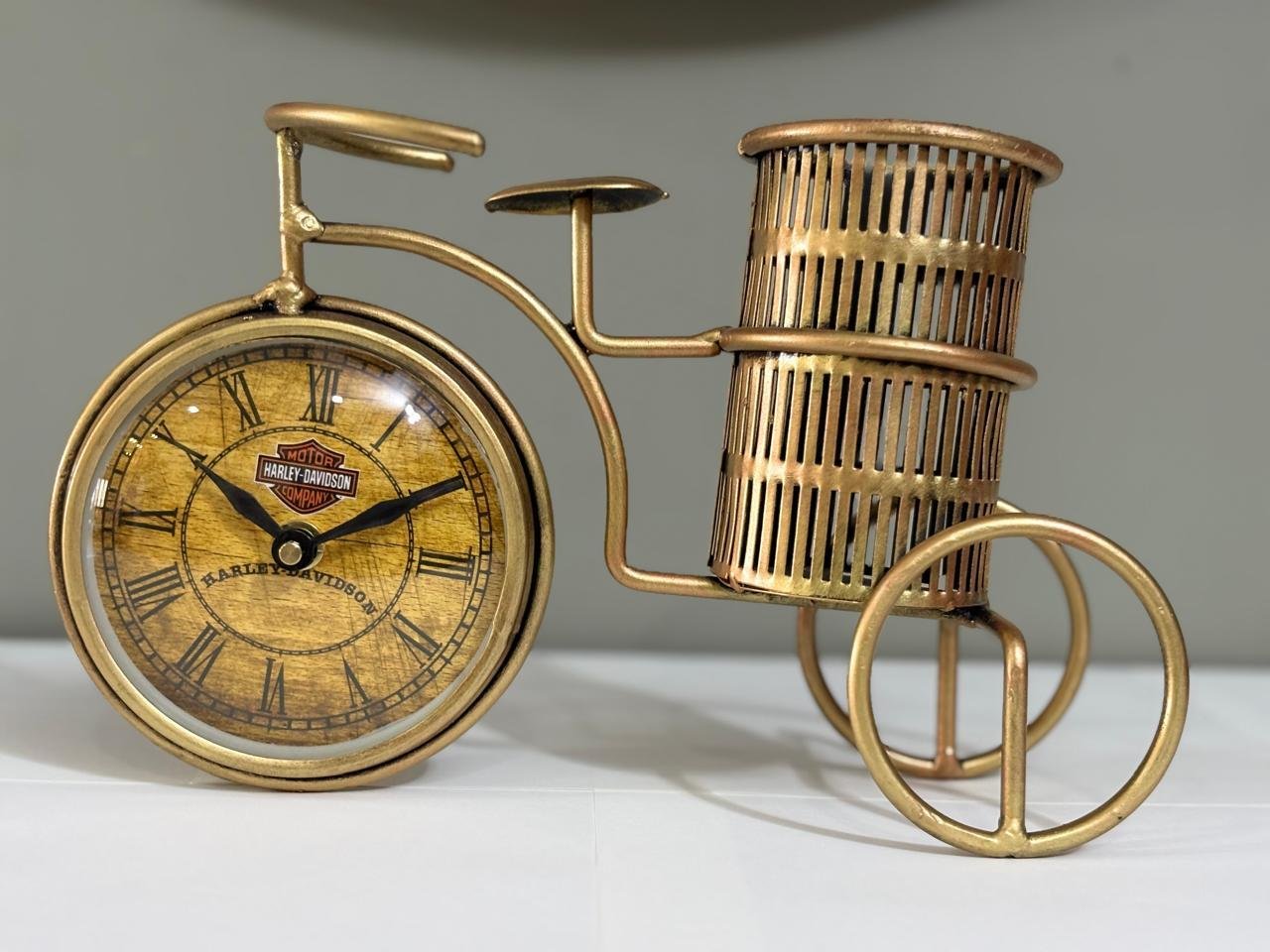 This charming decorative bicycle clock combines vintage aesthetics with practical functionality to create a unique accent piece for your home. Crafted from metal with an elegant gold finish, this whimsical tricycle design features a working clock with classic Roman numerals integrated into the front wheel, measuring 20 centimetres in length and 15 centimetres in height. The piece doubles as a planter, with a cylindrical basket holder positioned at the rear that's perfect for displaying small potted plants, succulents, or fresh flowers. Its compact size makes it ideal for placement on shelves, mantels, side tables, or office desks, adding a touch of nostalgic charm to any space. The intricate detailing of the bicycle frame, including handlebars, seat, and spoke patterns, showcases quality craftsmanship that elevates this piece beyond ordinary home décor. Whether you're looking to enhance your living room, bedroom, or workspace, this decorative clock planter serves as both a conversation starter and a functional timepiece that brings character and warmth to your interior design.