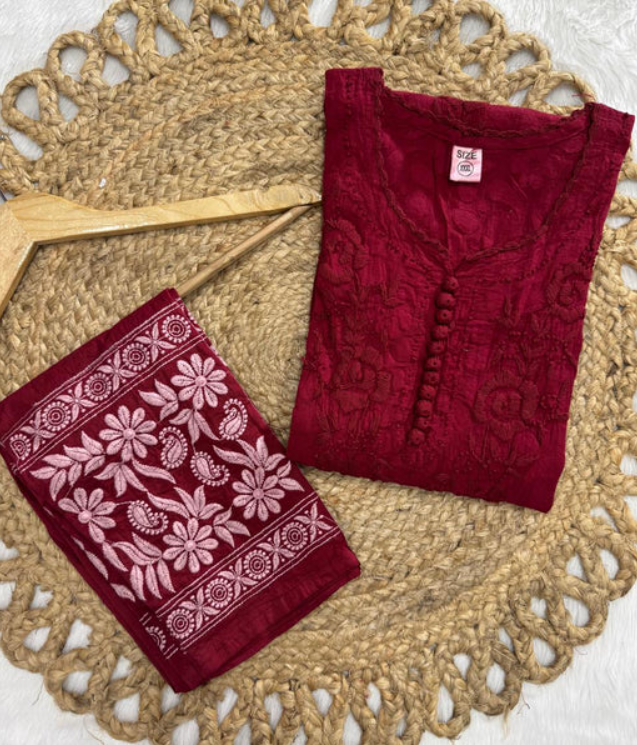 NANDINI Pure Brasso Chikan Kurti Pant Set Maroon