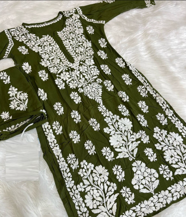 NATASHA Dark Green Pure Modal Chikankari Kurta Palazzo Set