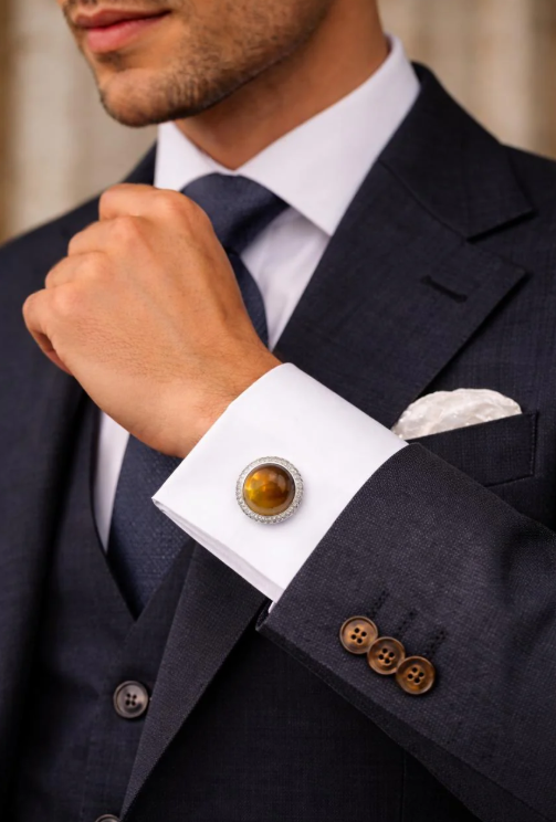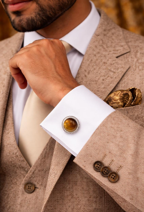 Elevate your formal wear with these striking Natural Certified Tiger's Eye Gemstone Cufflinks. Each pair features authentic tiger's eye stone, renowned for its distinctive golden-brown bands and lustrous chatoyant effect that catches light beautifully. Crafted for the discerning gentleman, these cufflinks combine timeless elegance with natural gemstone sophistication. The certified tiger's eye stones are set in quality metal, making them perfect for weddings, business meetings, or special occasions. Tiger's eye is believed to promote confidence and clarity, adding symbolic meaning to your accessory collection. Whether paired with formal shirts or dress wear, these cufflinks make a refined statement that reflects your attention to detail and appreciation for natural beauty.