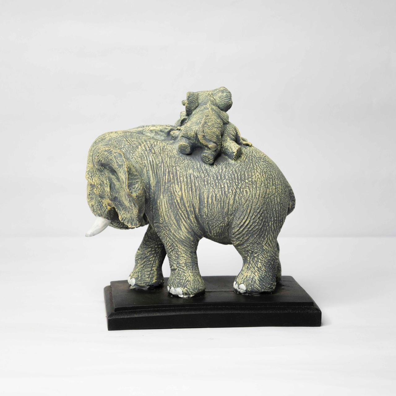 - Add a touch of whimsy to your home décor with this charming elephant figurine sculpture. Beautifully crafted with intricate details, this decorative piece showcases a majestic elephant carrying a baby elephant on its back, symbolising the deep bond between parent and child. The sculpture features a weathered grey finish that highlights the textured surfaces, from the elephant's wrinkled skin to its impressive tusks. Mounted on a sleek black base for stability and presentation, this piece makes for an eye-catching display on shelves, mantels, or office desks. The detailed craftsmanship captures the gentle nature of these magnificent creatures, making it a perfect conversation starter and an elegant addition to any room. This decorative statue serves as both an artistic centrepiece and a reminder of wildlife's natural grace.