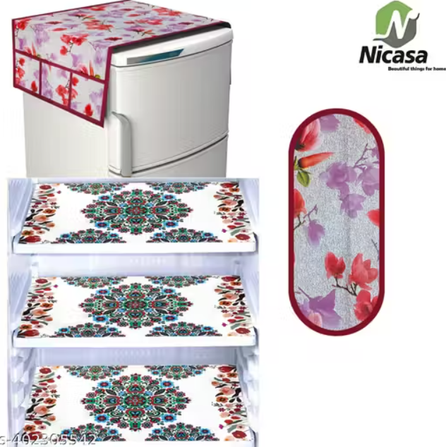 NicasaHD Premium Quality Fridge cover for Top with 1 pec handle set and 3 pec fridge mats - Set of 5 piece